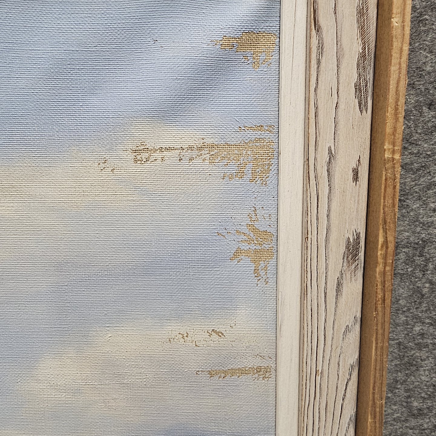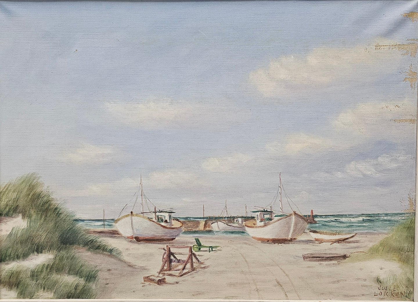 Maleri af oliemaling på lærred, med motiv af en strand med fiskerbåde på land