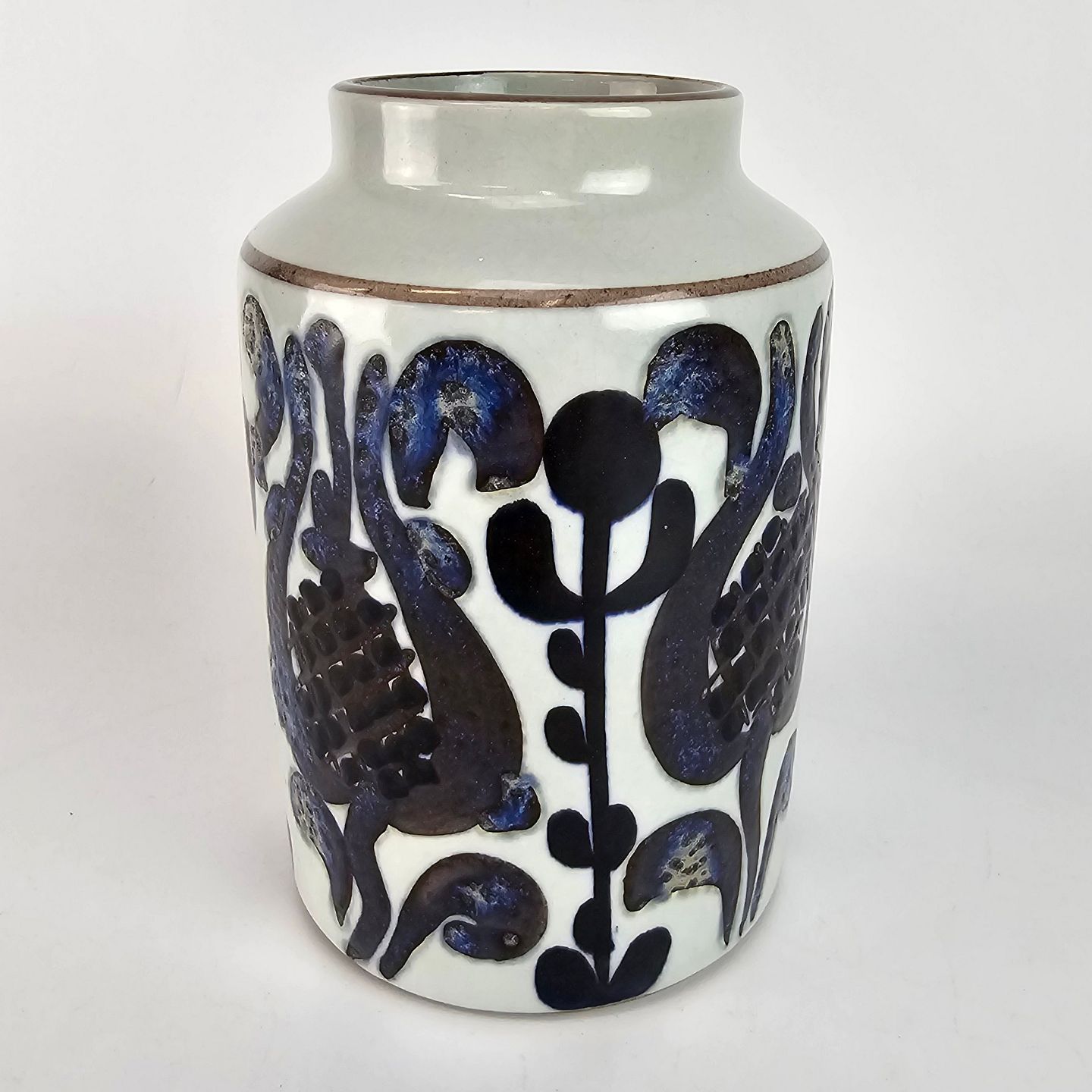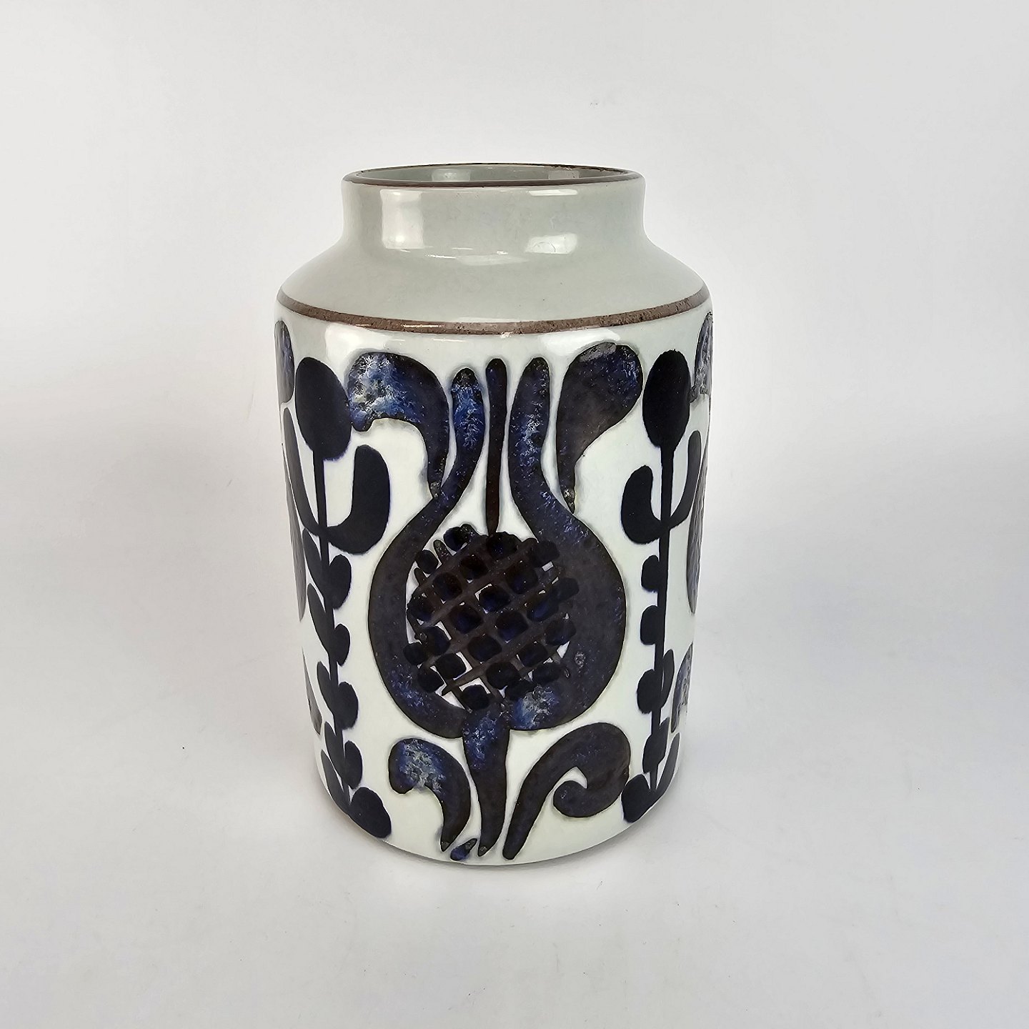 Cylinderformet vase af fajance porcelæn, dekoreret med sort og blåt mønstre. Nr. 592/3428