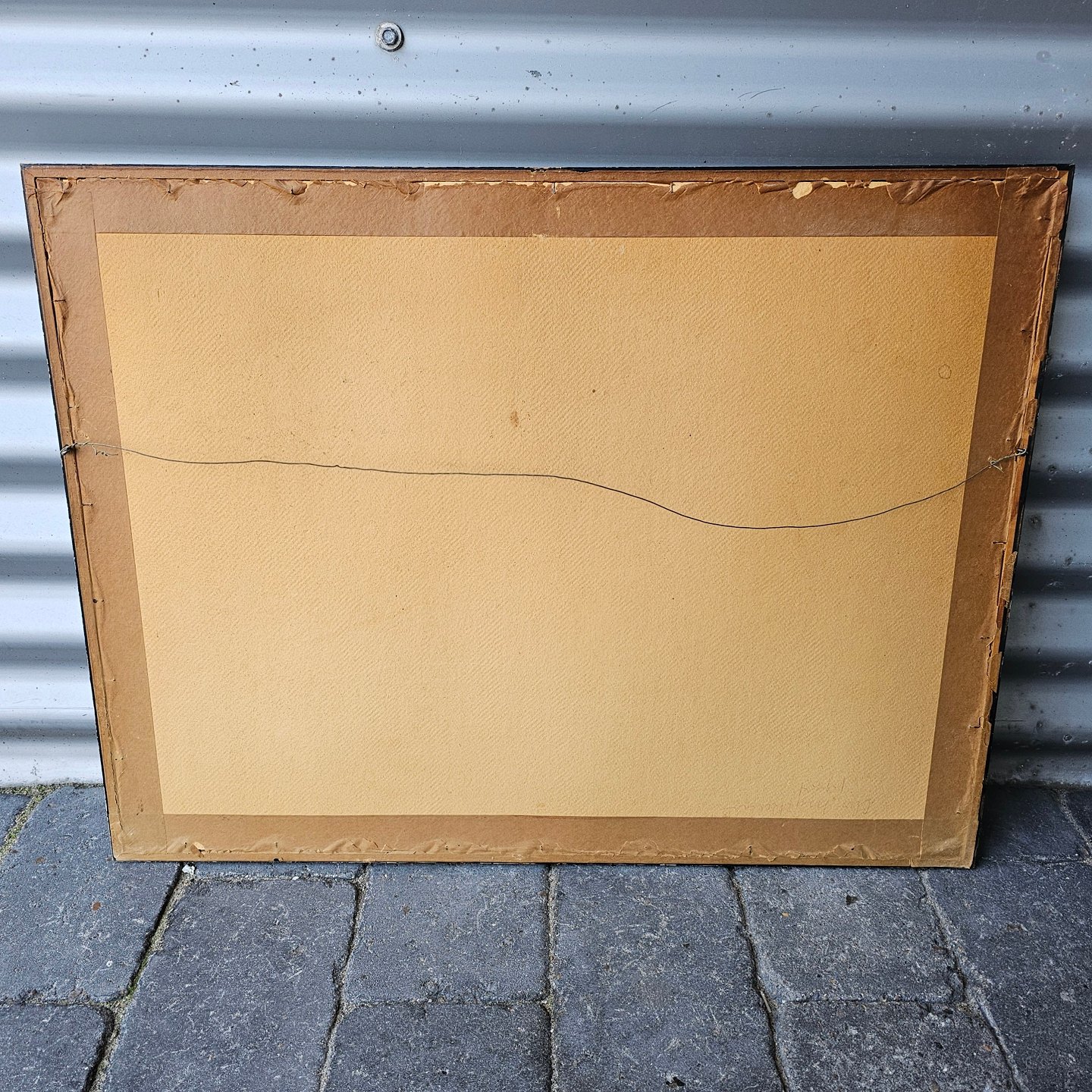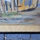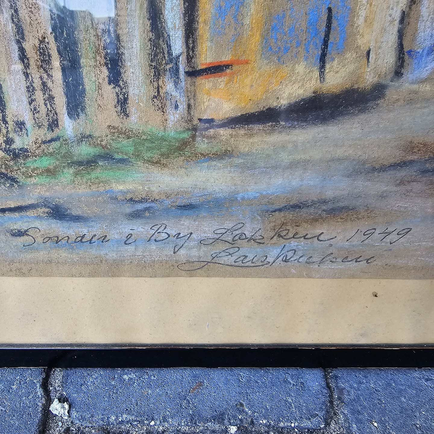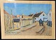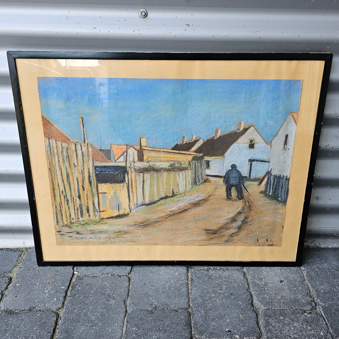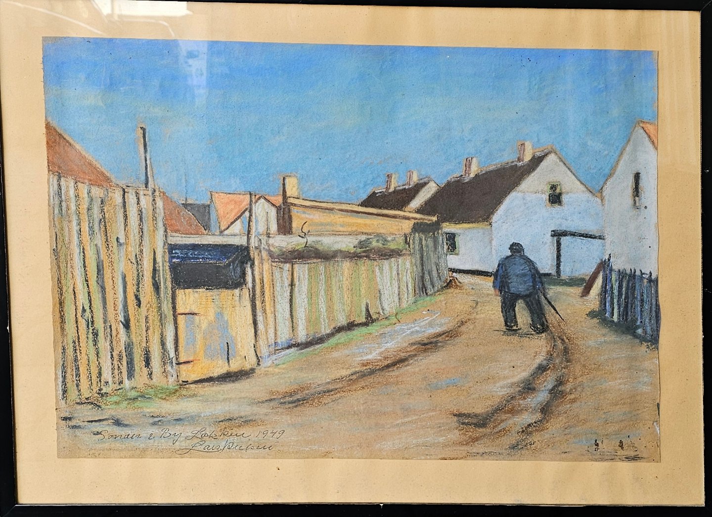 Indrammet Oliekridttegning i sort træramme med motiv af ældre herre med stok i smøge med titlen Sonden by i Løkken 1949