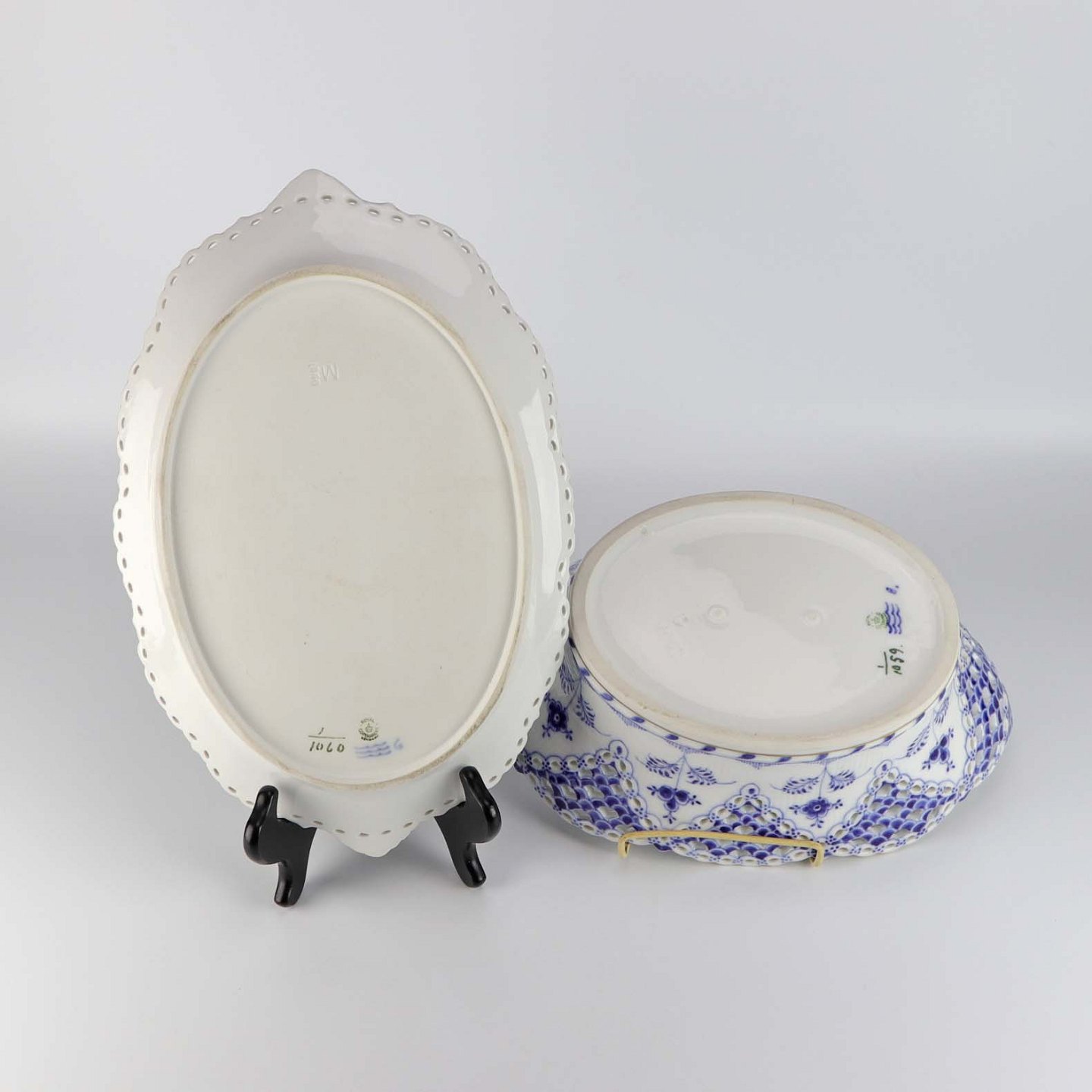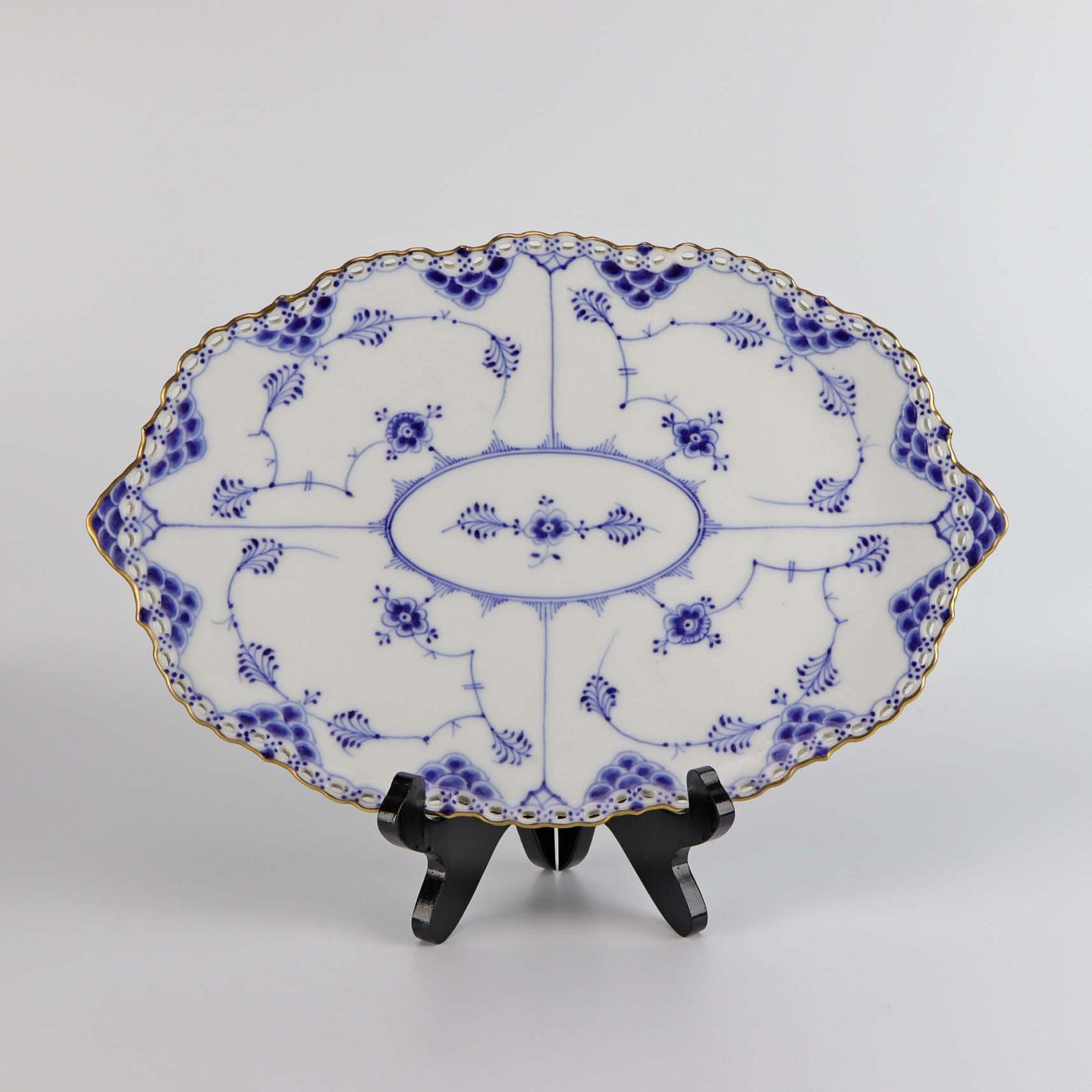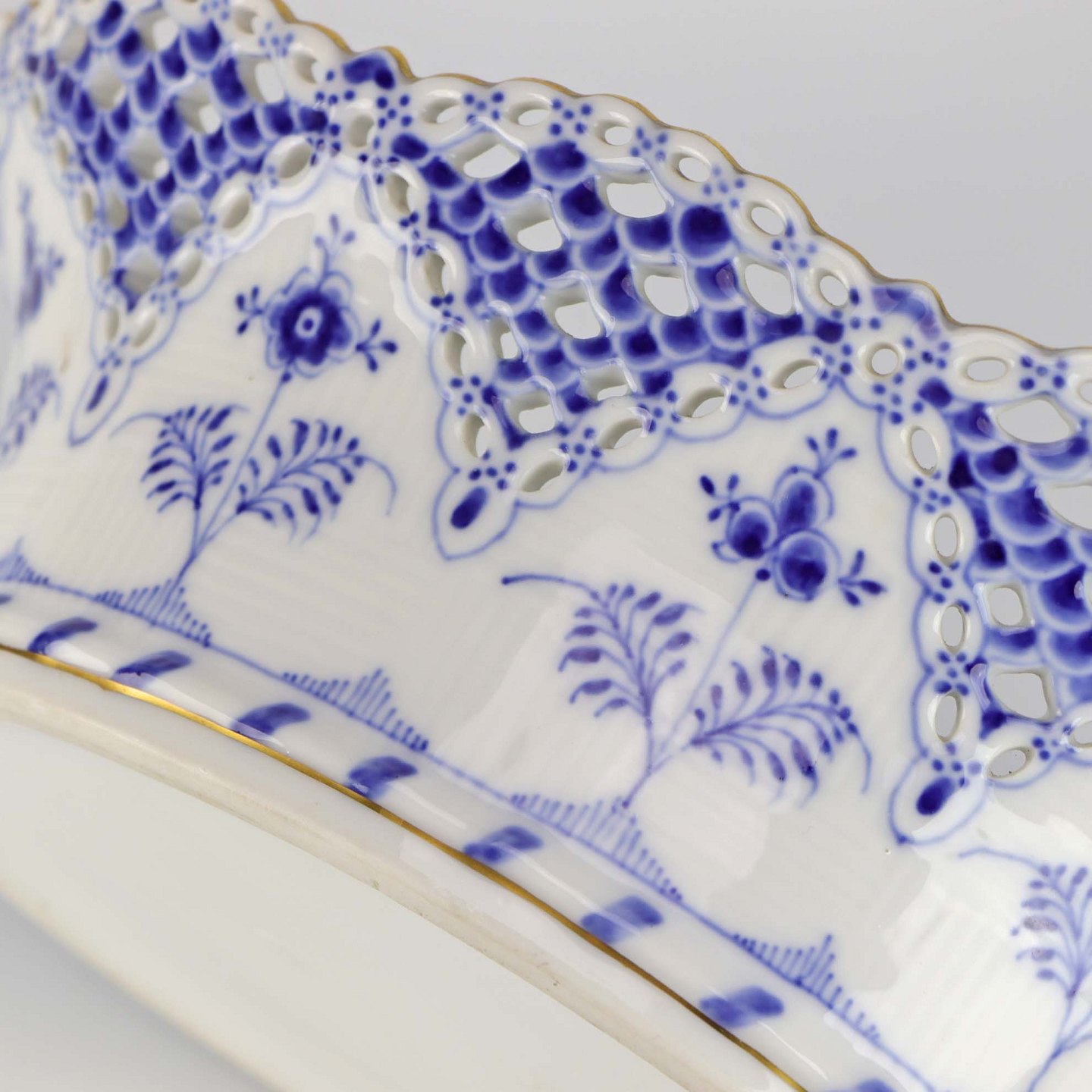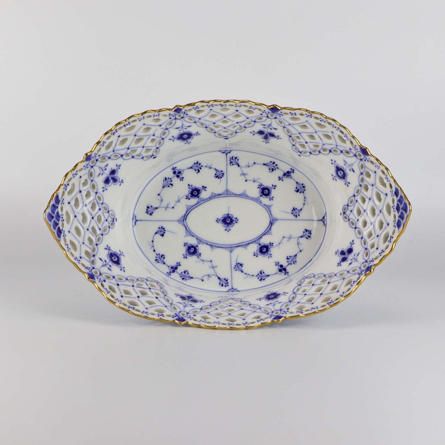 Stellet Musselmalet Helblonde er hvidt porcelæn dekoreret med blå blomster og mønstre. Øverst er porcelænet dekoreret med hulmønster.