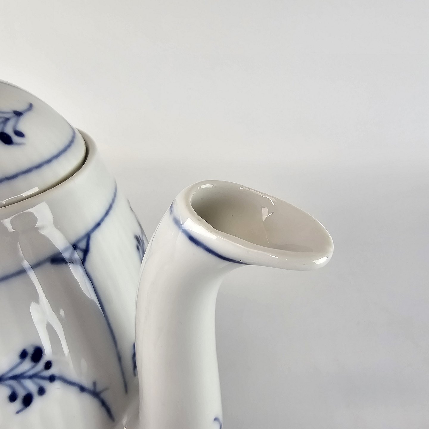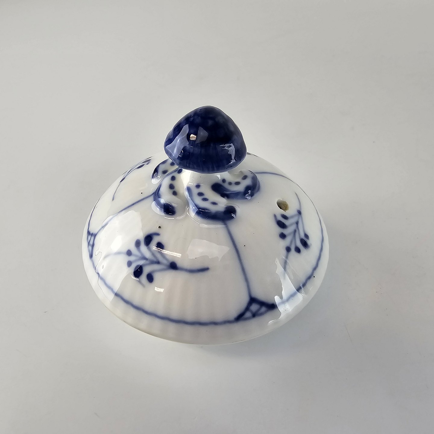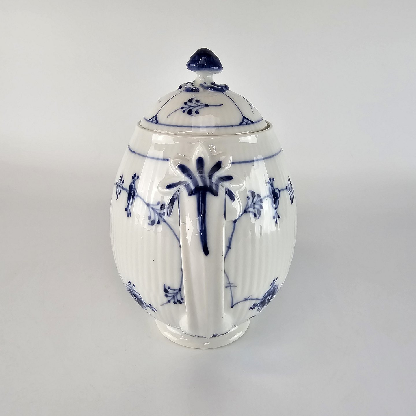 Musselmalet er af kongeligt hvidt porcelæn, dekoreret med rifler og mønster af blå ranker og blomster