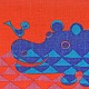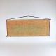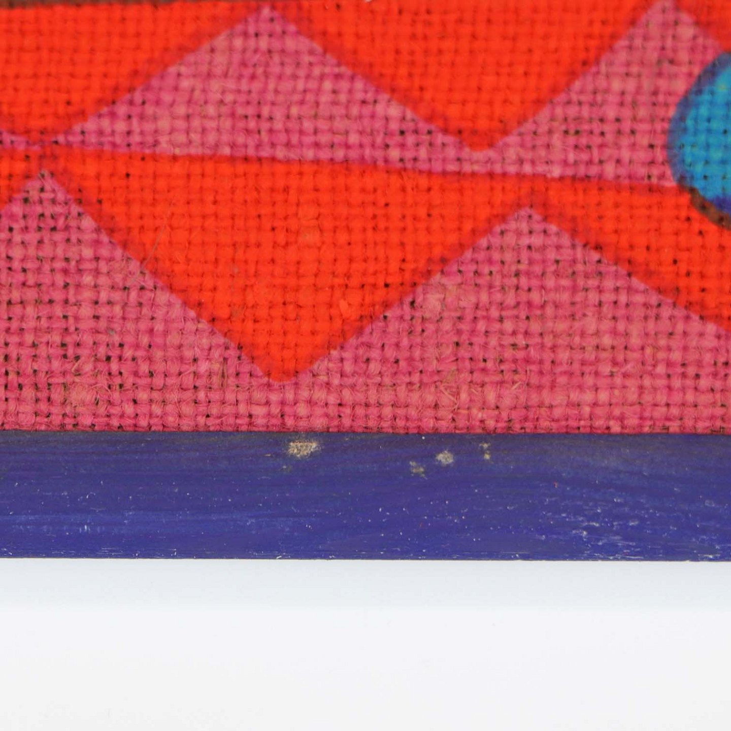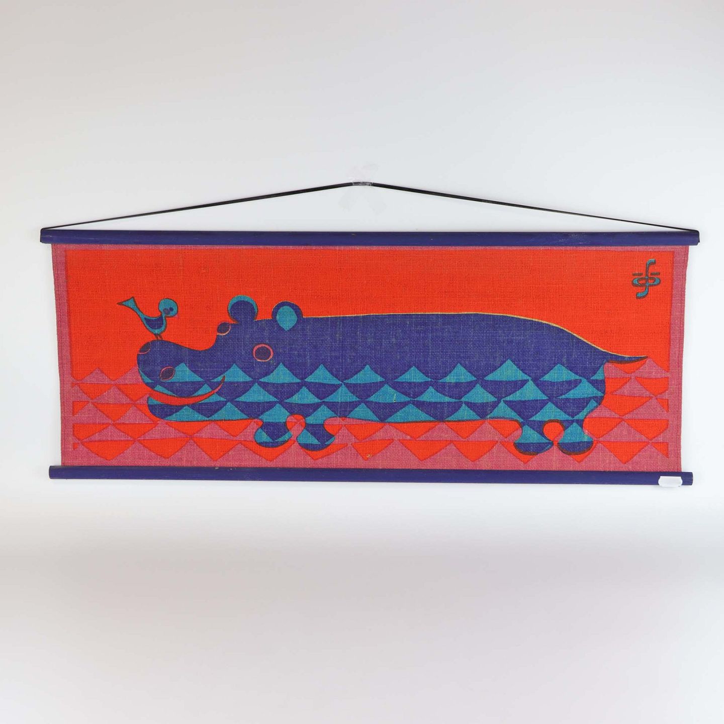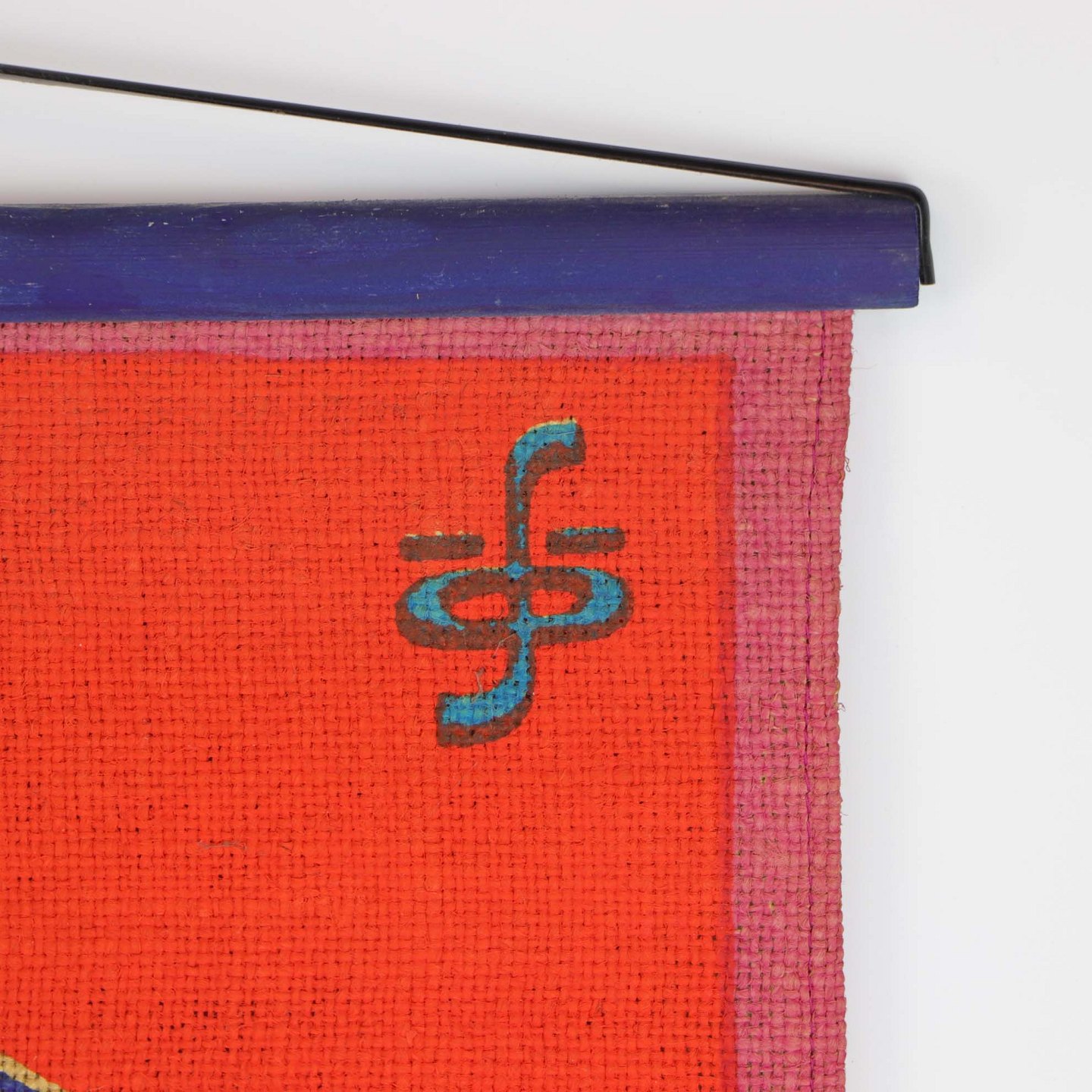 Vægophæng i malet hessian med motiv af fugl på flodhest i blå, turkis, orange og pink nuancer med blåmalet træramme og sort gummisnor