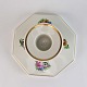 Bordstage i glat kantet hvidt porcelæn med faverige motiver af blomster og guldkant