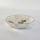 Hvidt porcelæn i skælform med dekoration af gule blomster og guldkant