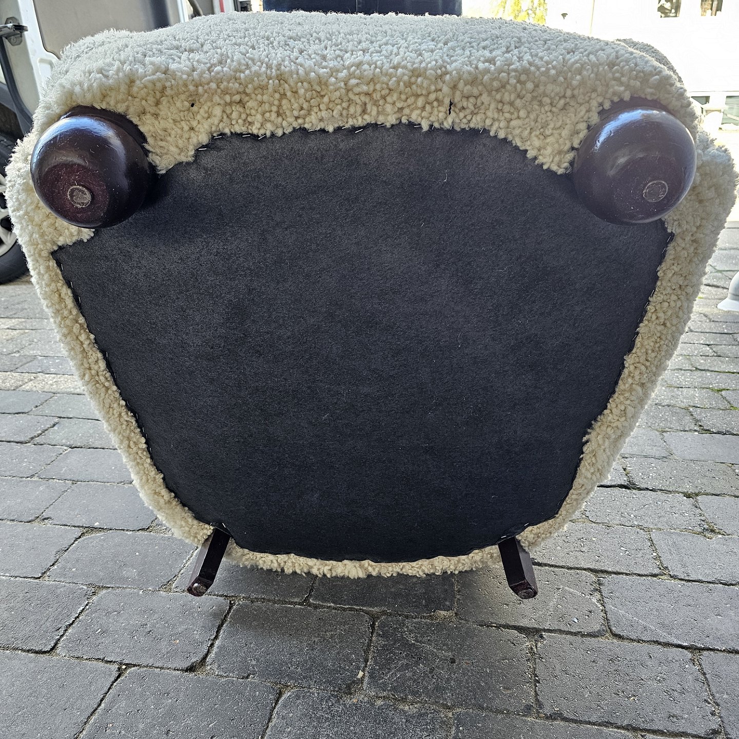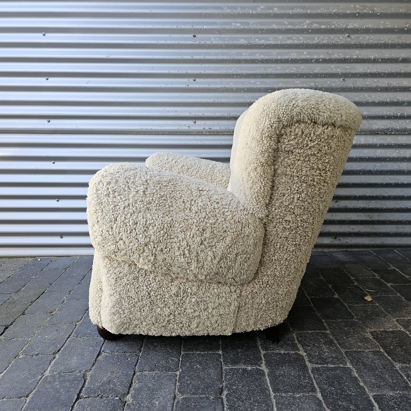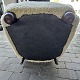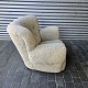 Lænestol med høj ryg og armlæn. Sædet er med spiralfjedre og hele stolen er ny-ompolstret. Derudover er bamsestolen ny-ombetrukket med lammeskind. Produceret i 20'erne.