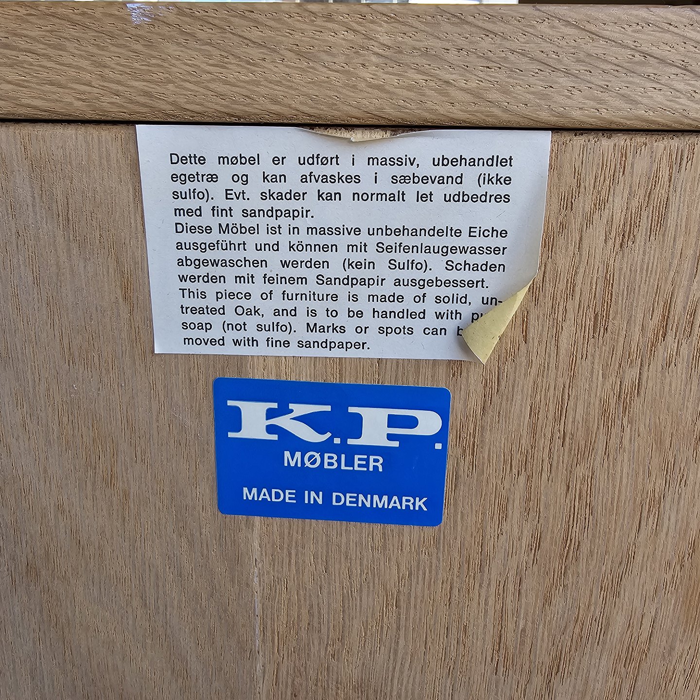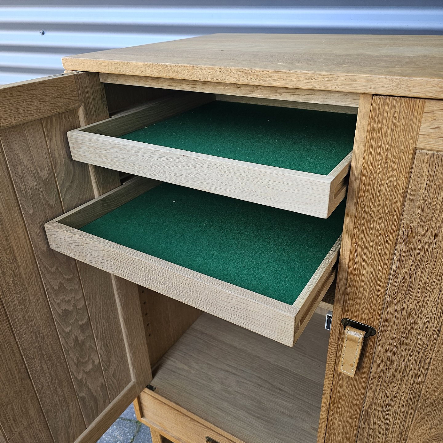 Bestikskab i massivt ubehandlet egetræ. Bag lågerne er der hylder og skuffer. Grebene er af beige læder