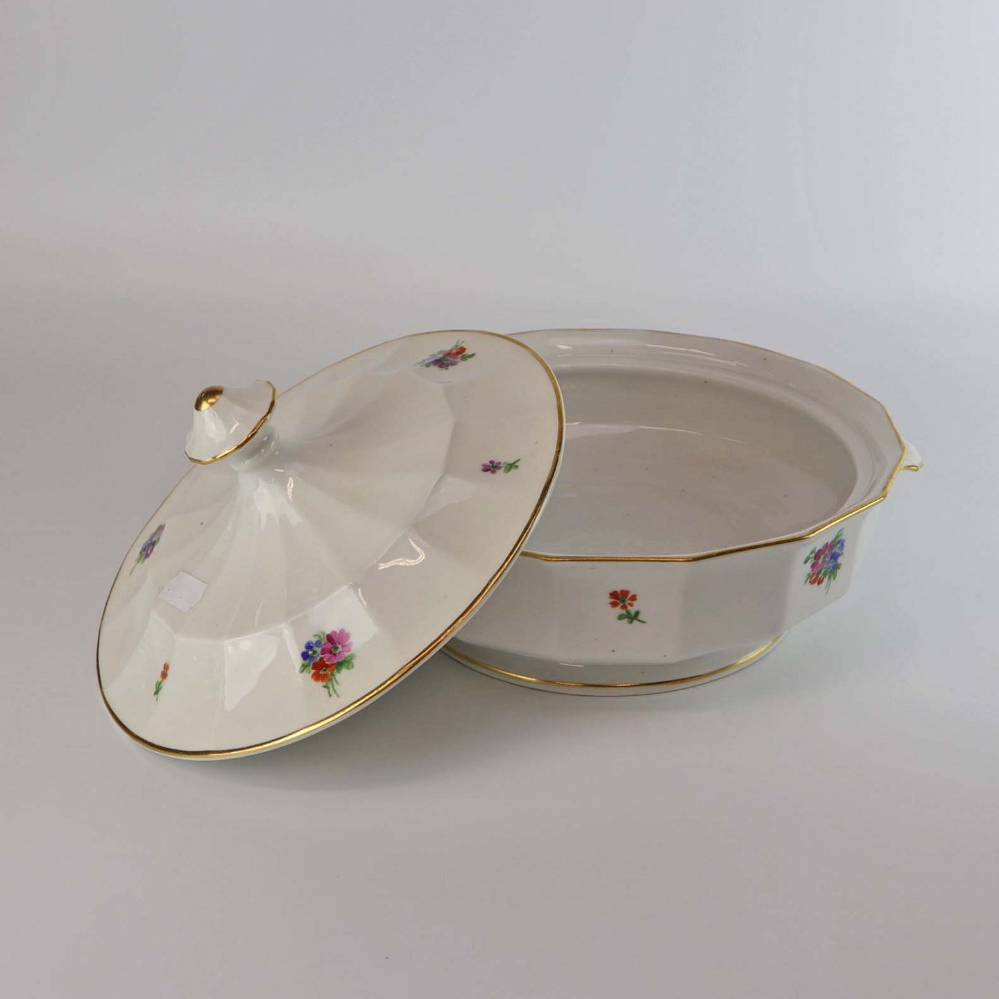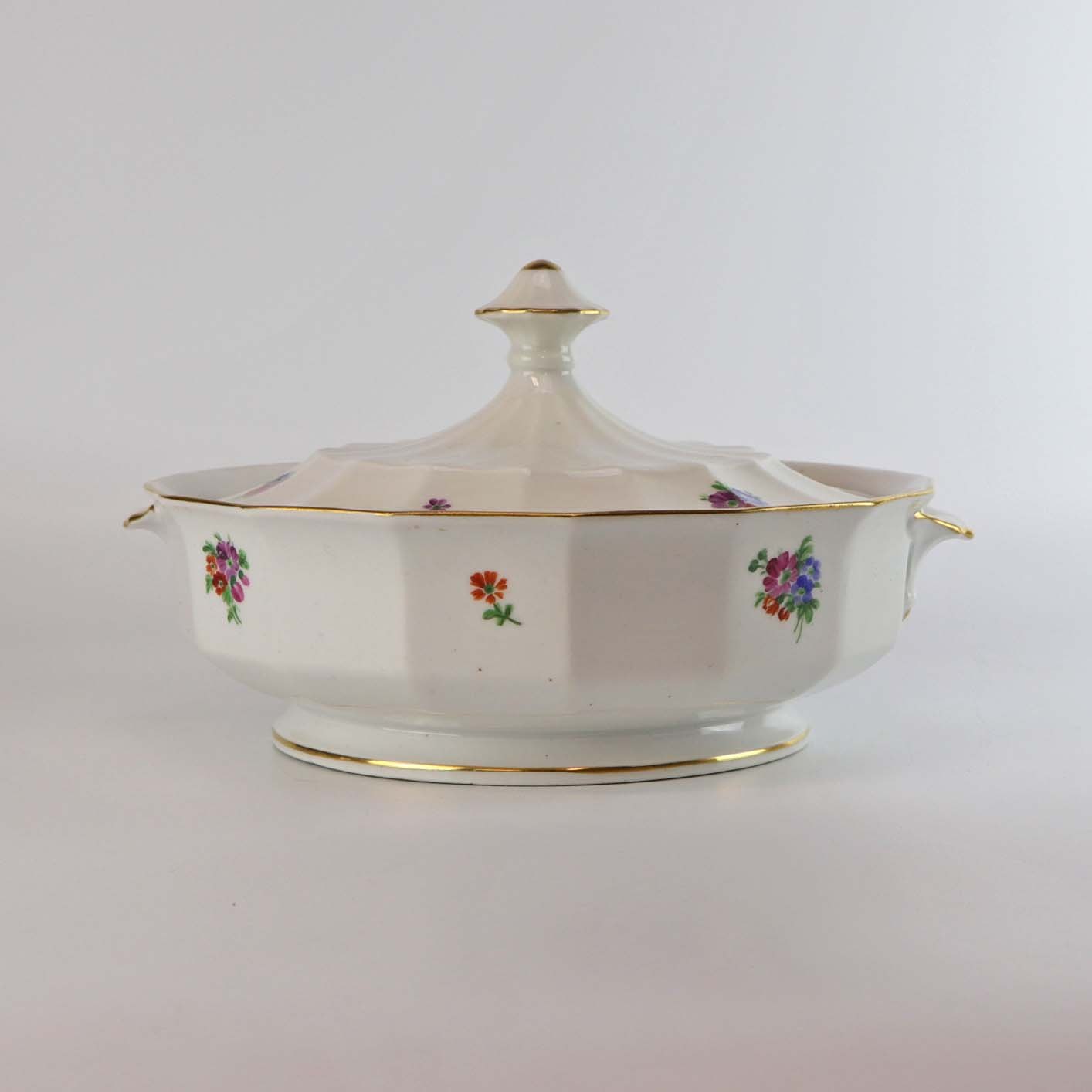 Suppeterrin i glat kantet hvidt porcelæn med faverige motiver af blomster og guldkant