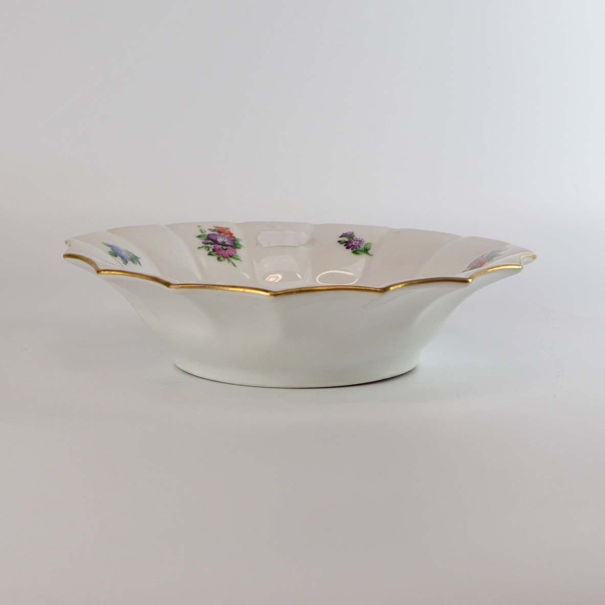 Salatskål i glat kantet hvidt porcelæn med faverige motiver af blomster og guldkant