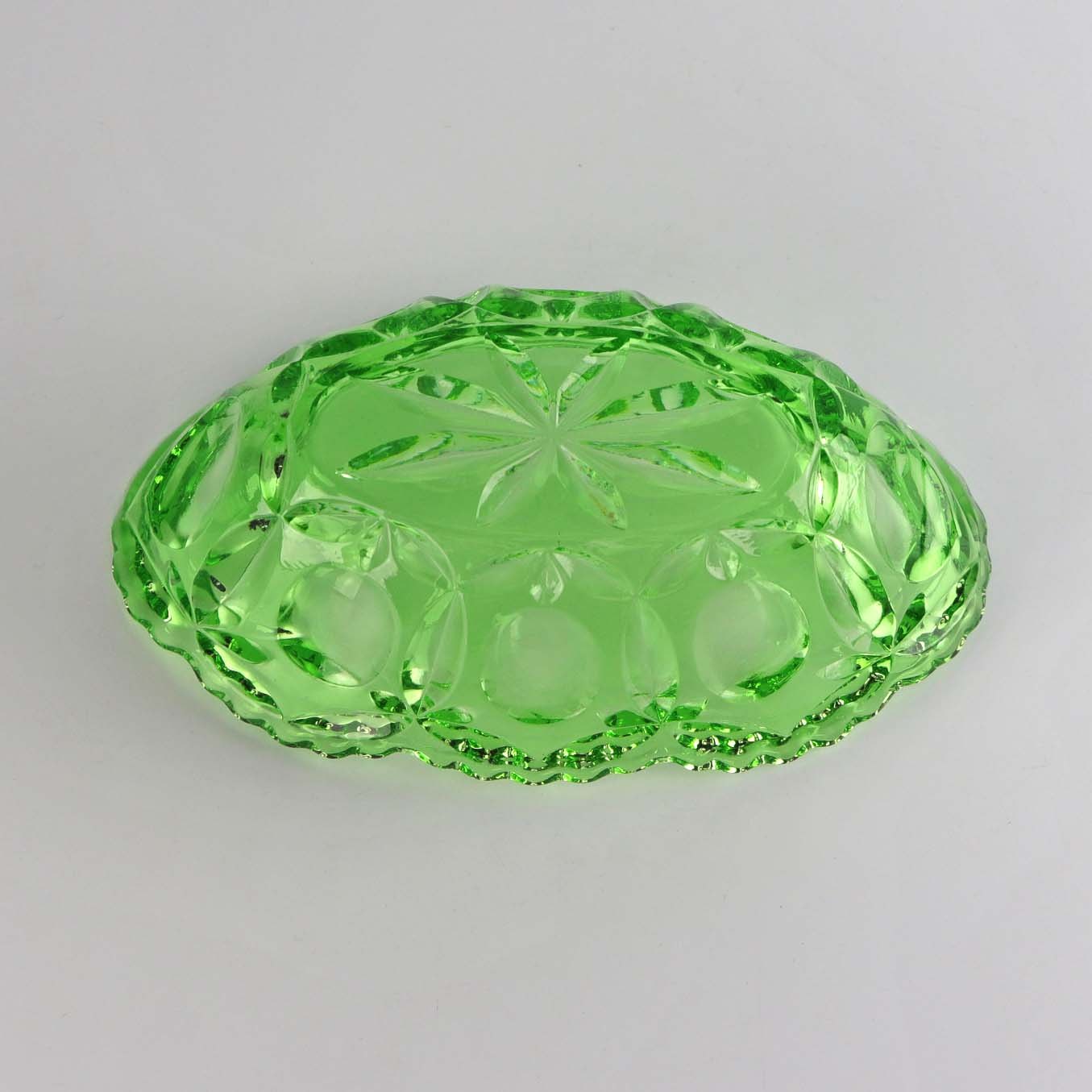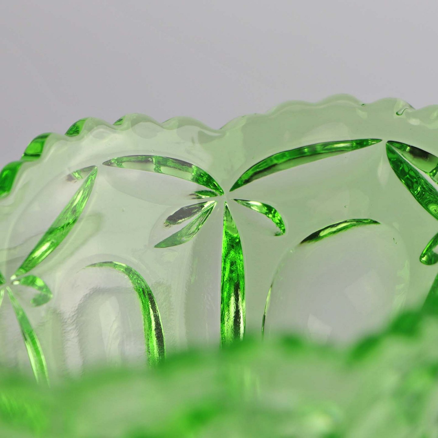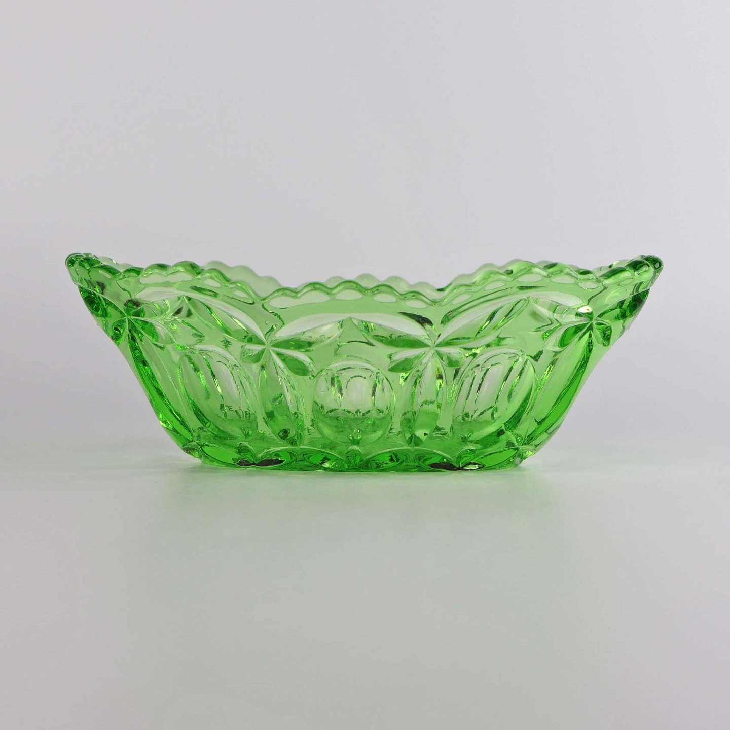 Skål i presset grønt glas med blomstermotiv. Navngivet Rolf. Blev produceret i 1934