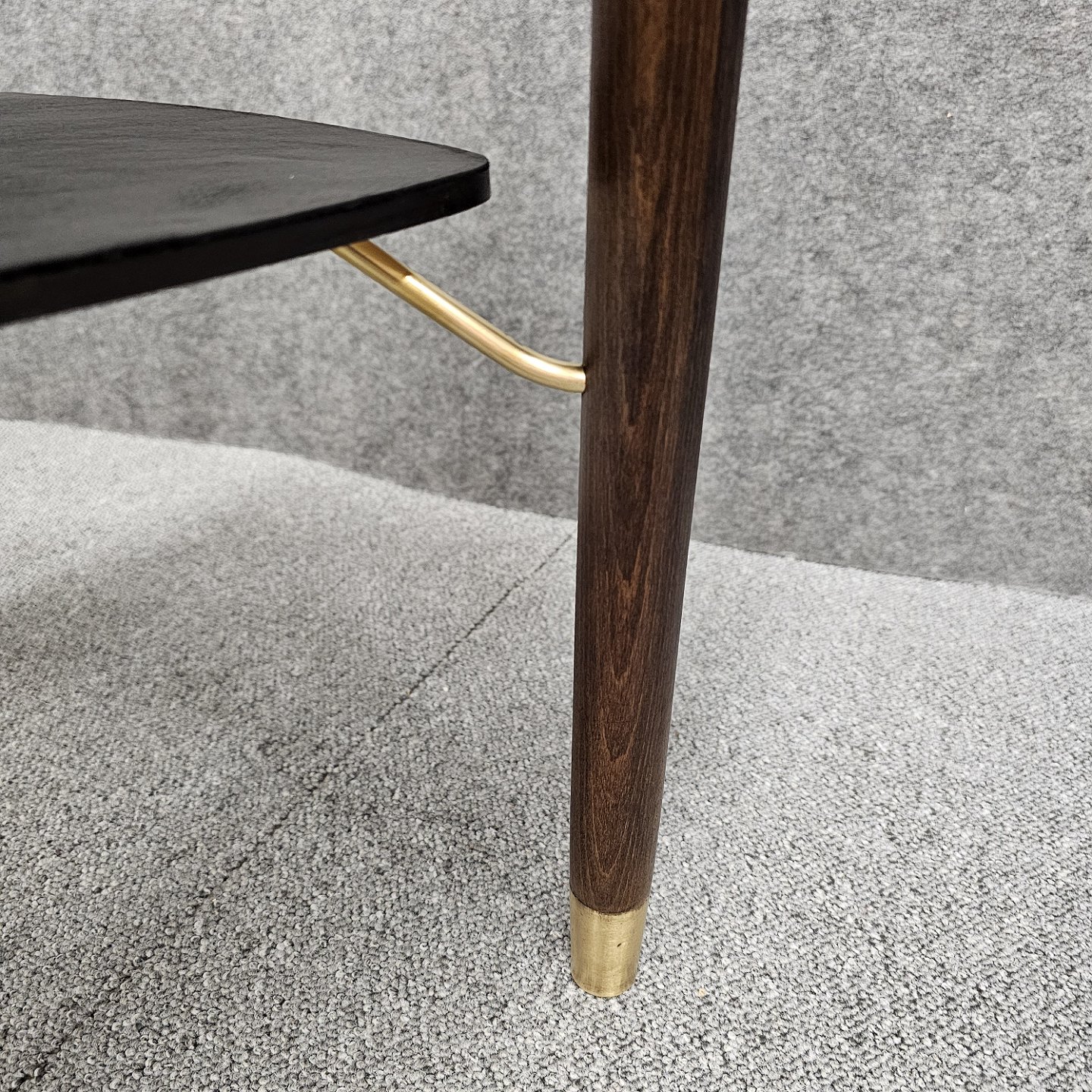 Trekantet sidebord i teaktræ malet med mørk bejdse og pyntet med messing. Hylden er beklædt med læder. Bordet er nyrestaureret
