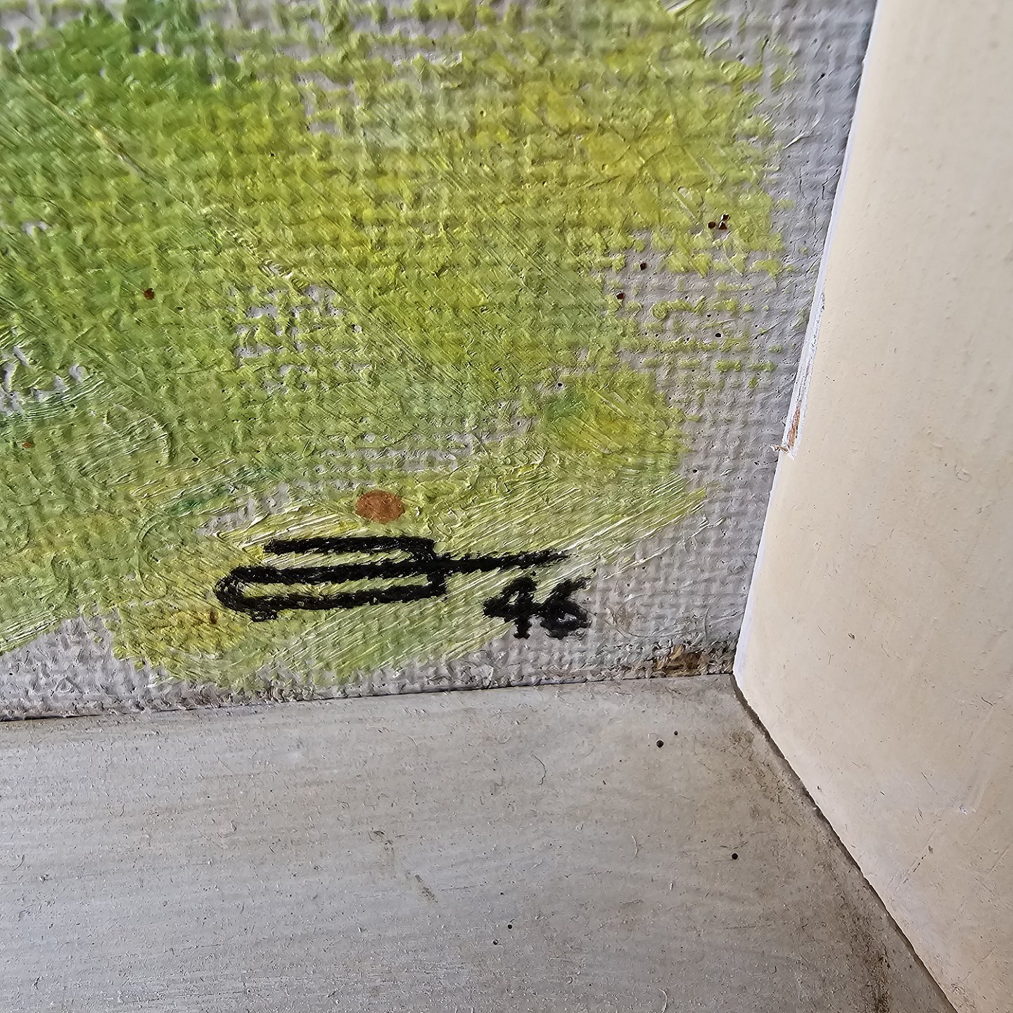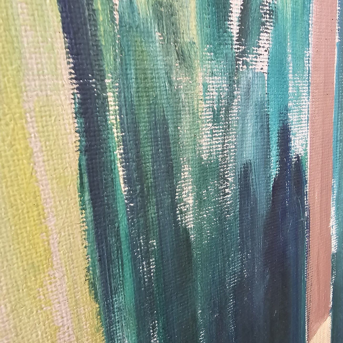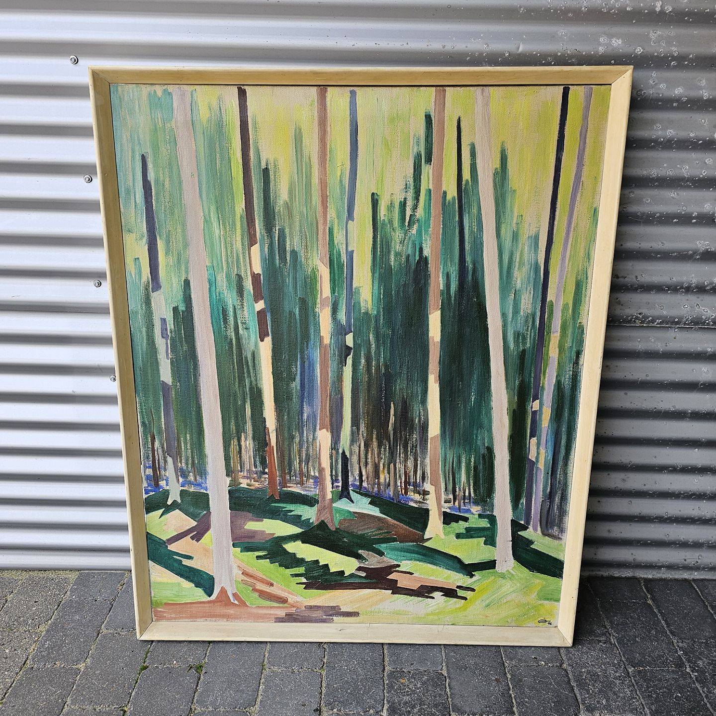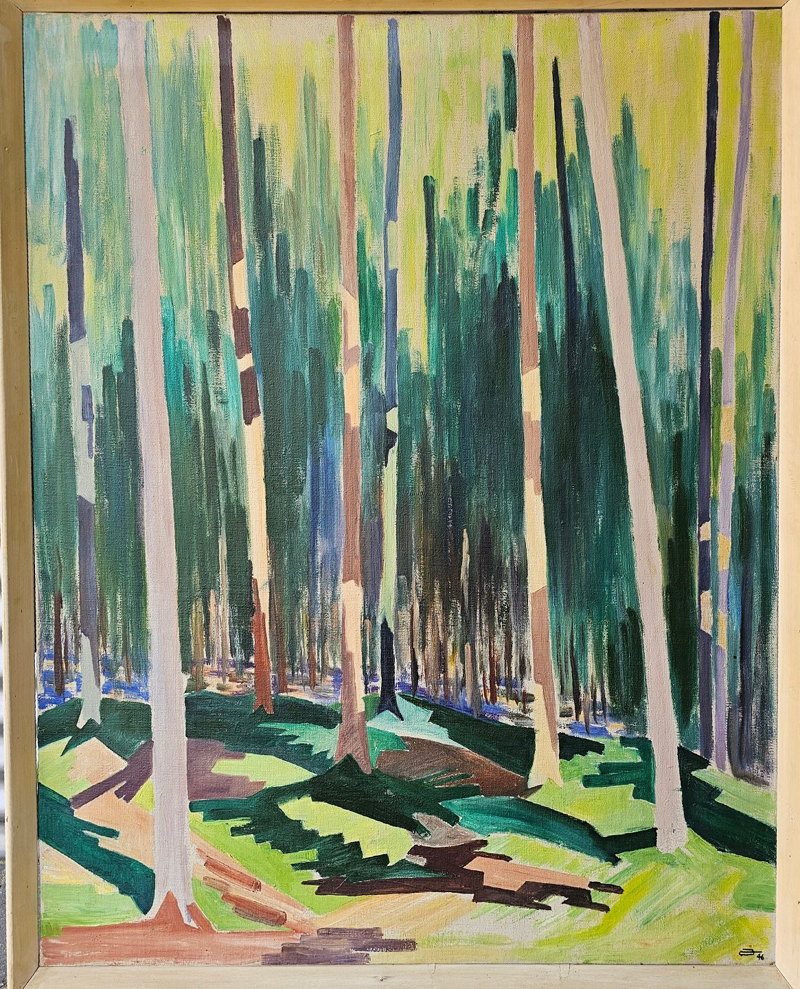 Maleri af olie på lærred, med motiv af abstrakt skov og grønne nuancer.