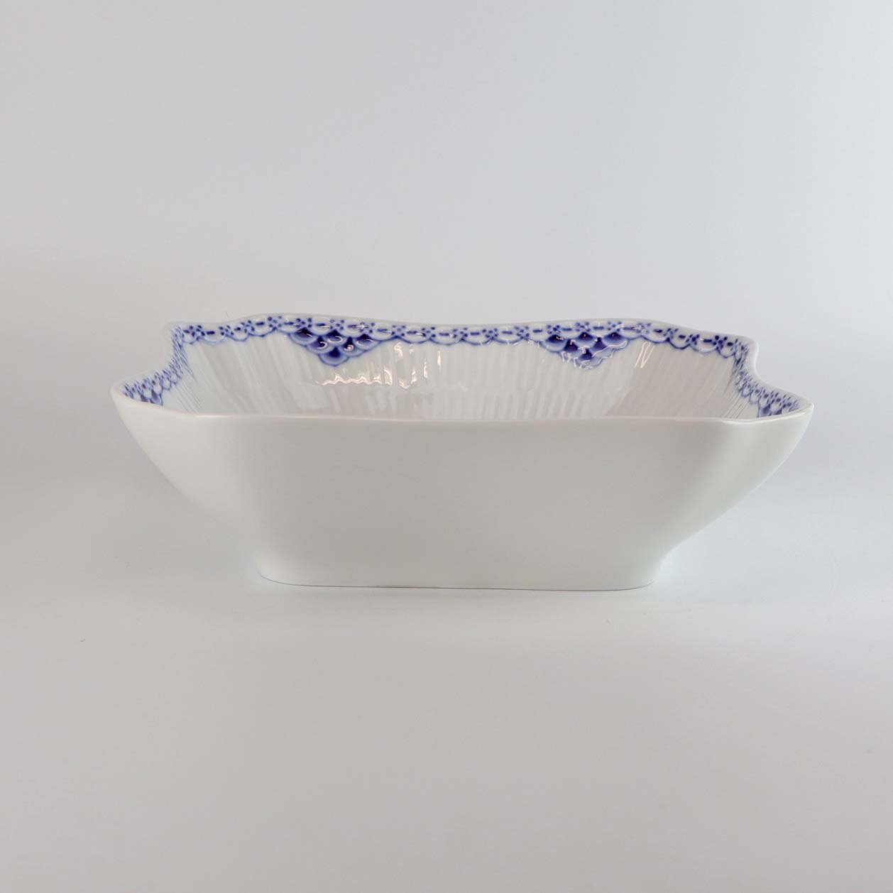 Stellet er fremstillet i riflet hvidt porcelæn med blåmalet blonder og fiskeskældsdekoration