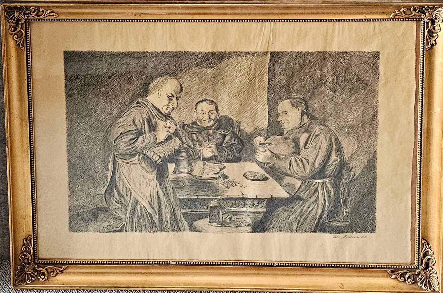 Bogtryk med motiv af 3 munke ved et spisebord.