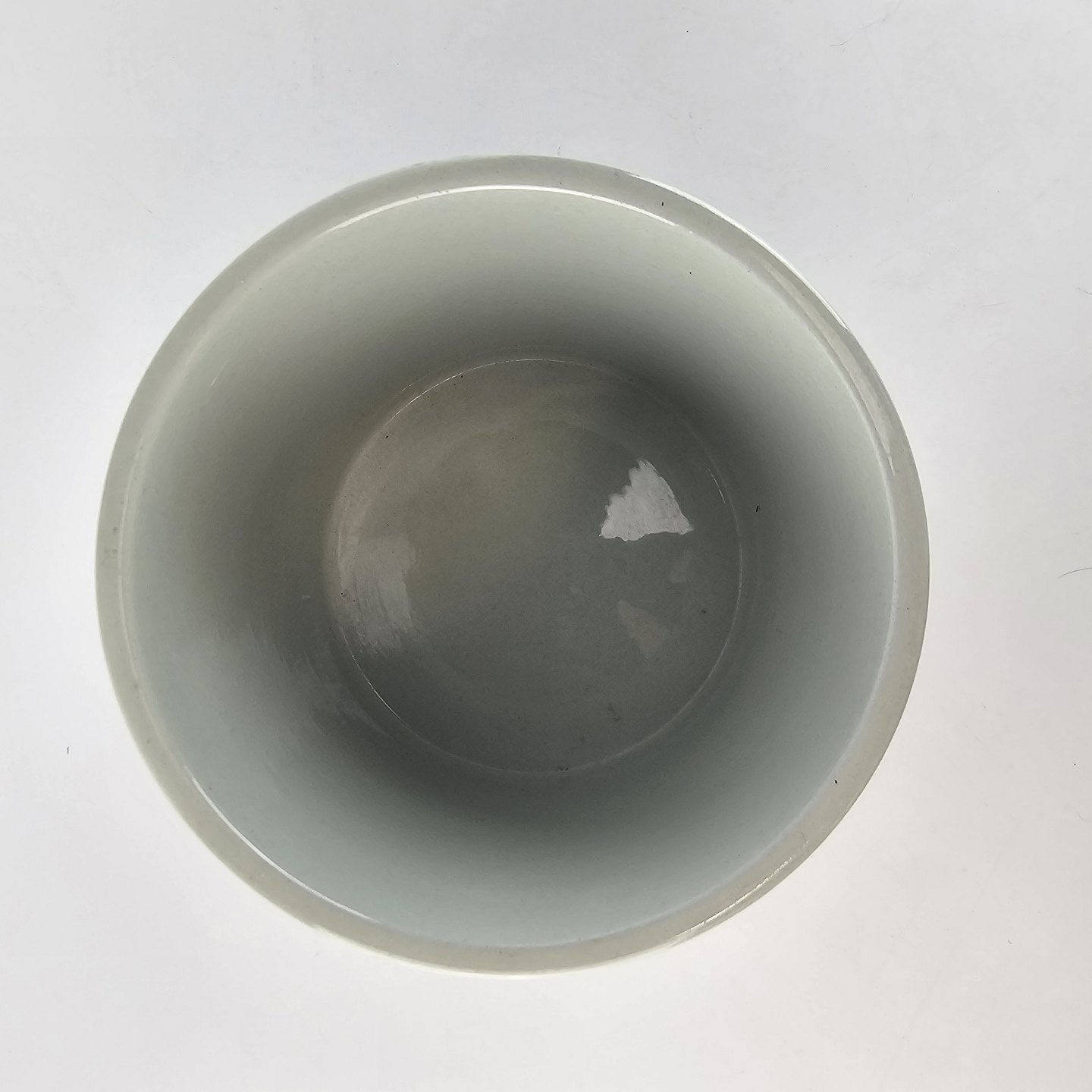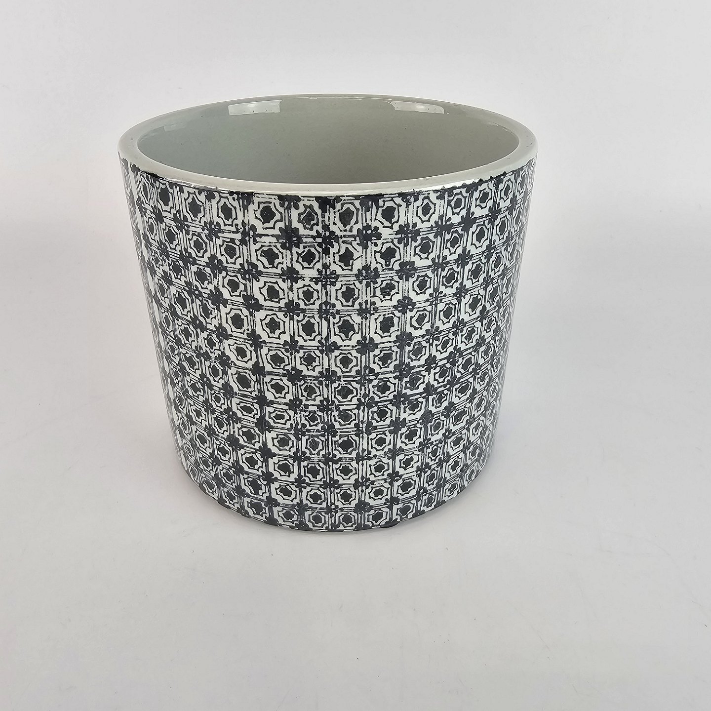 Urtepotteskjuler af keramik med det klassiske sort/hvide mønster og derudover dekoreret med en person med grønlandsk tøj, en sæl, fisk og snevejr