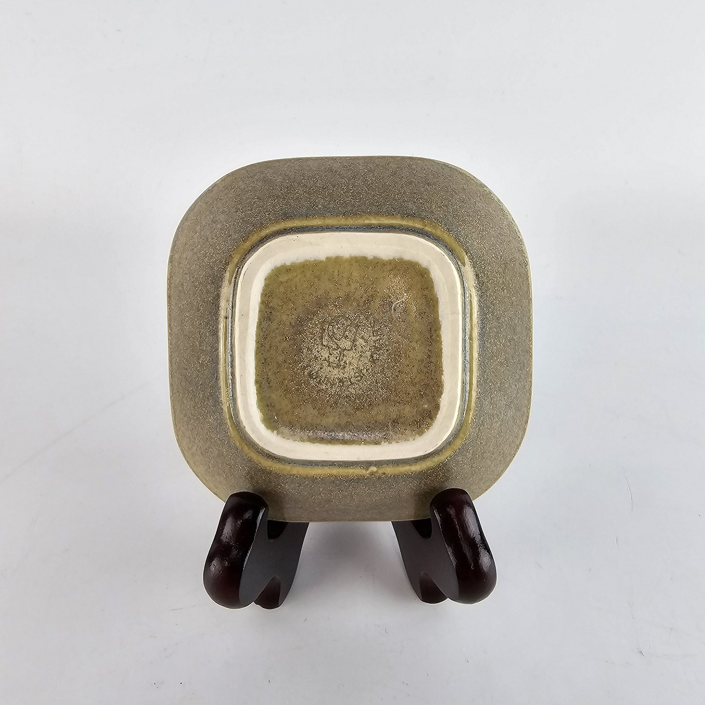 Kvadratisk asiet af stentøj og dekoreret med en grønlig nuancefarvet glasering. Fra serien Knabstrup - ofte kaldet Grøn Nøddebo