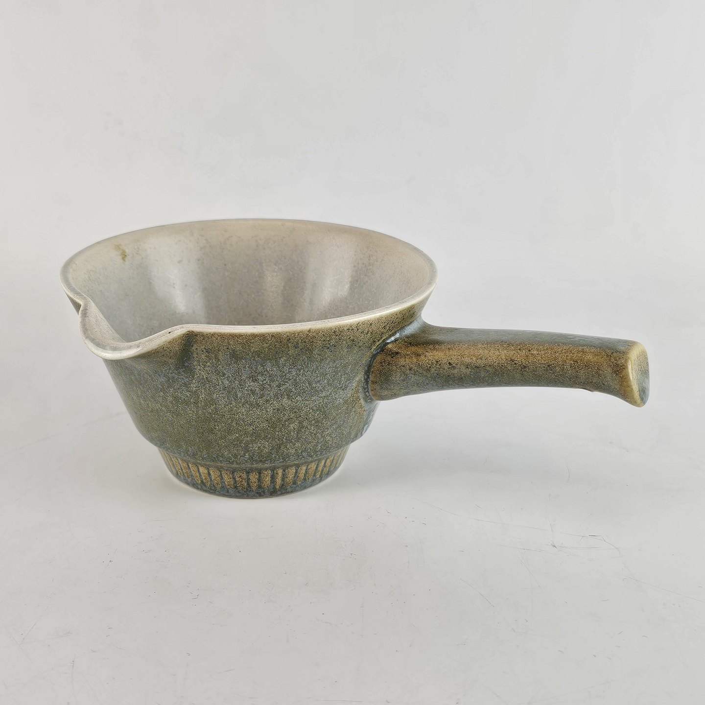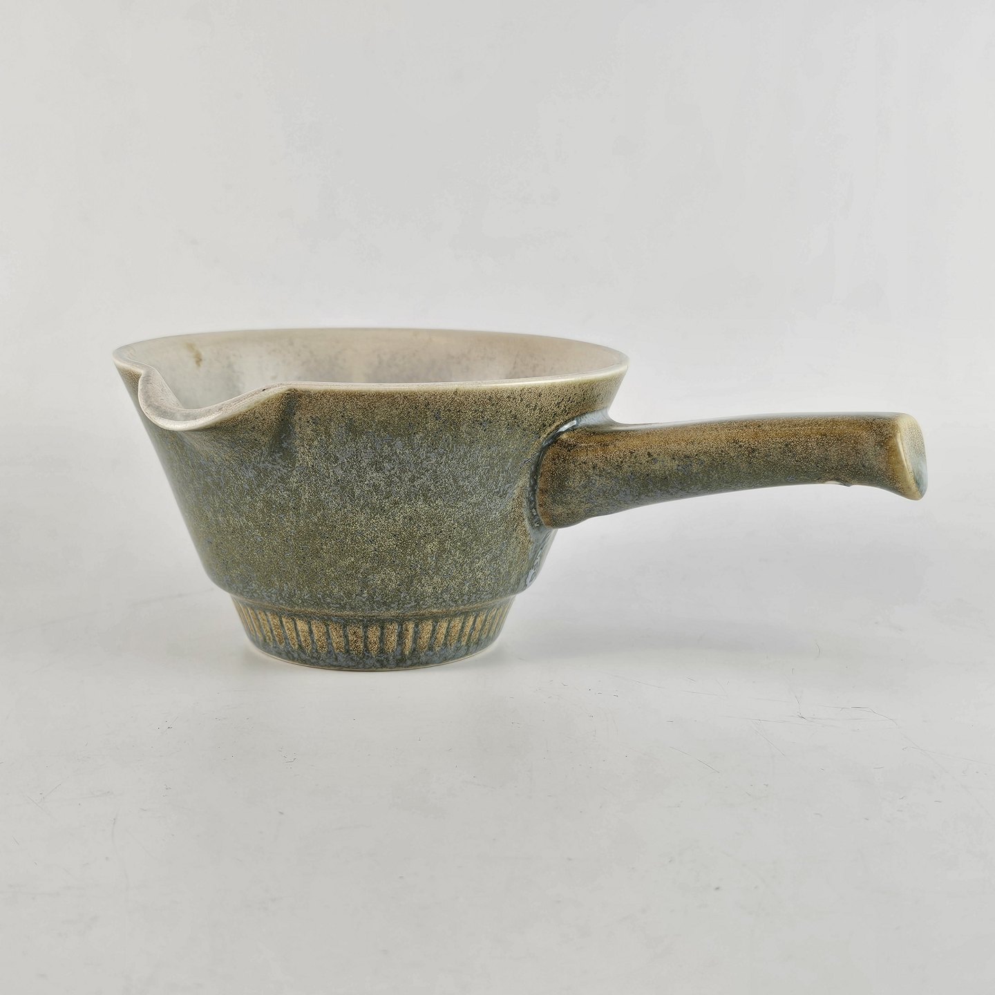 Smørnæb af stentøj og dekoreret med en grønlig nuancefarvet glasering.