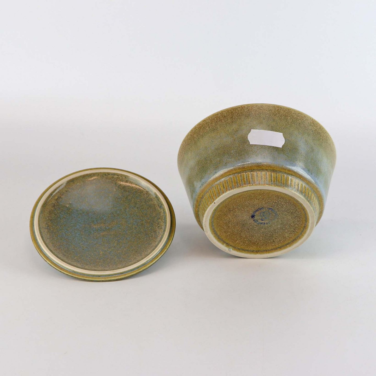 Skål med låg af stentøj og dekoreret med en grønlig nuancefarvet glasering.