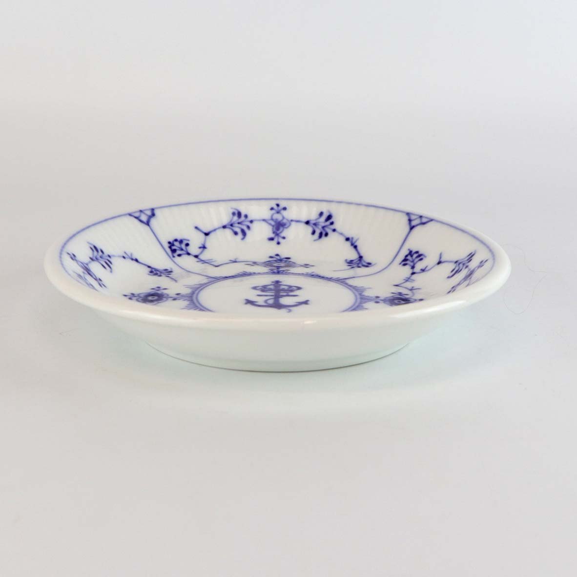 Kongelig sidetallerken i porcelæn med motiv af anker og krone fra stellet Musselmalet Riflet Hotelporcelæn nr. 1/2017