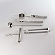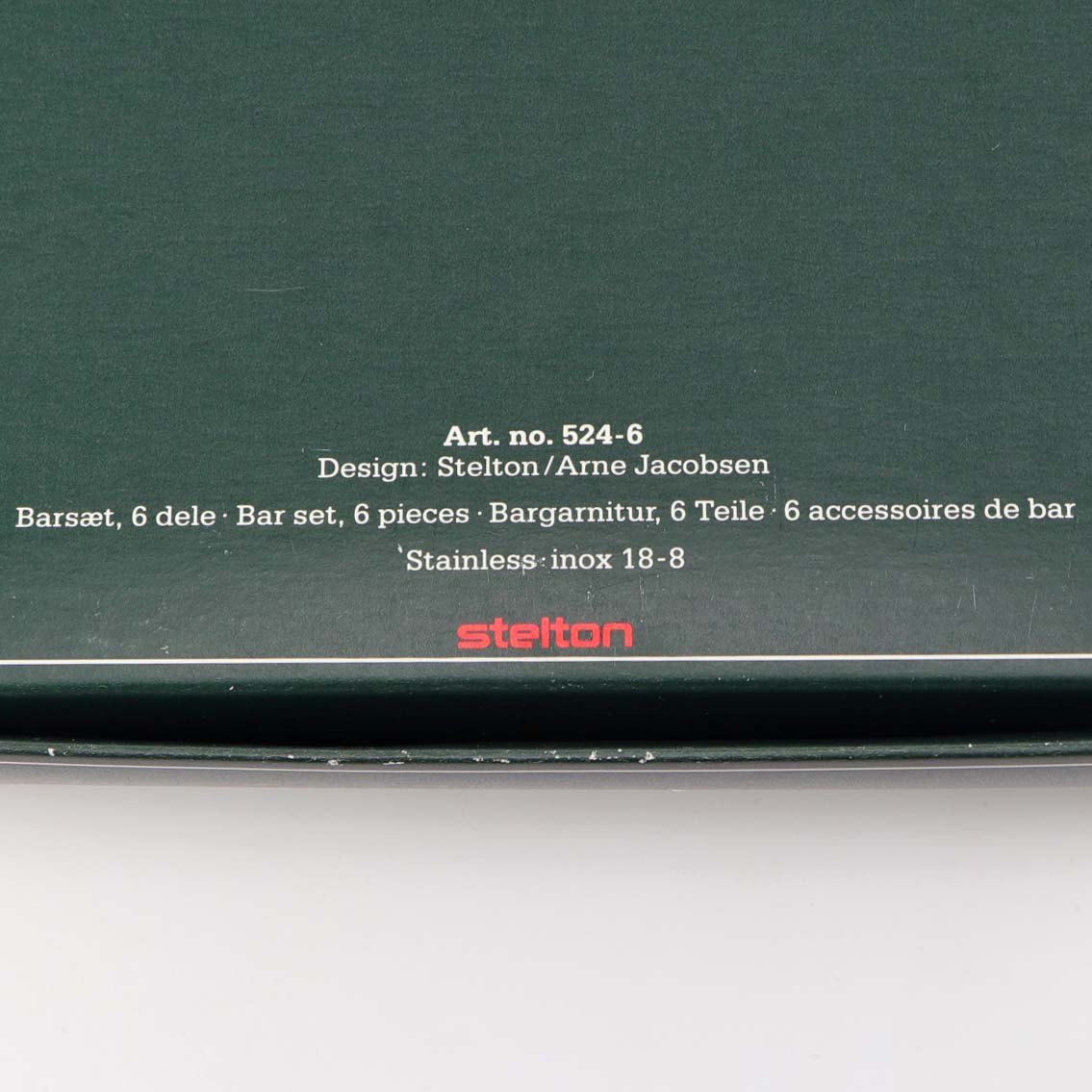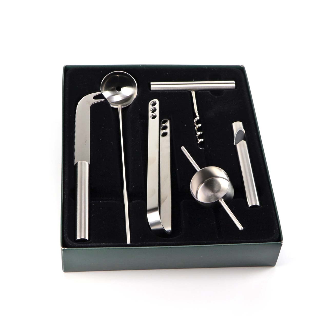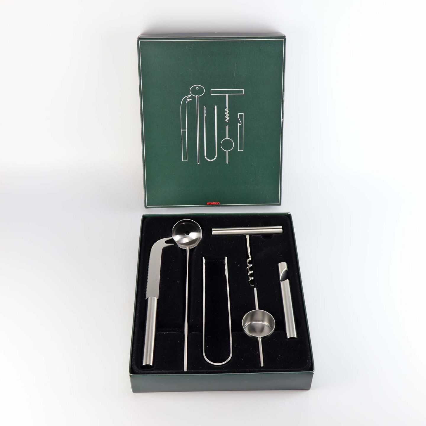 Service sæt til bar i rustfrit stål med seks forskellige dele. Sættet består af oplukker, proptrækker, målebæger, tang, ske og kniv. Opbevaret i original æske