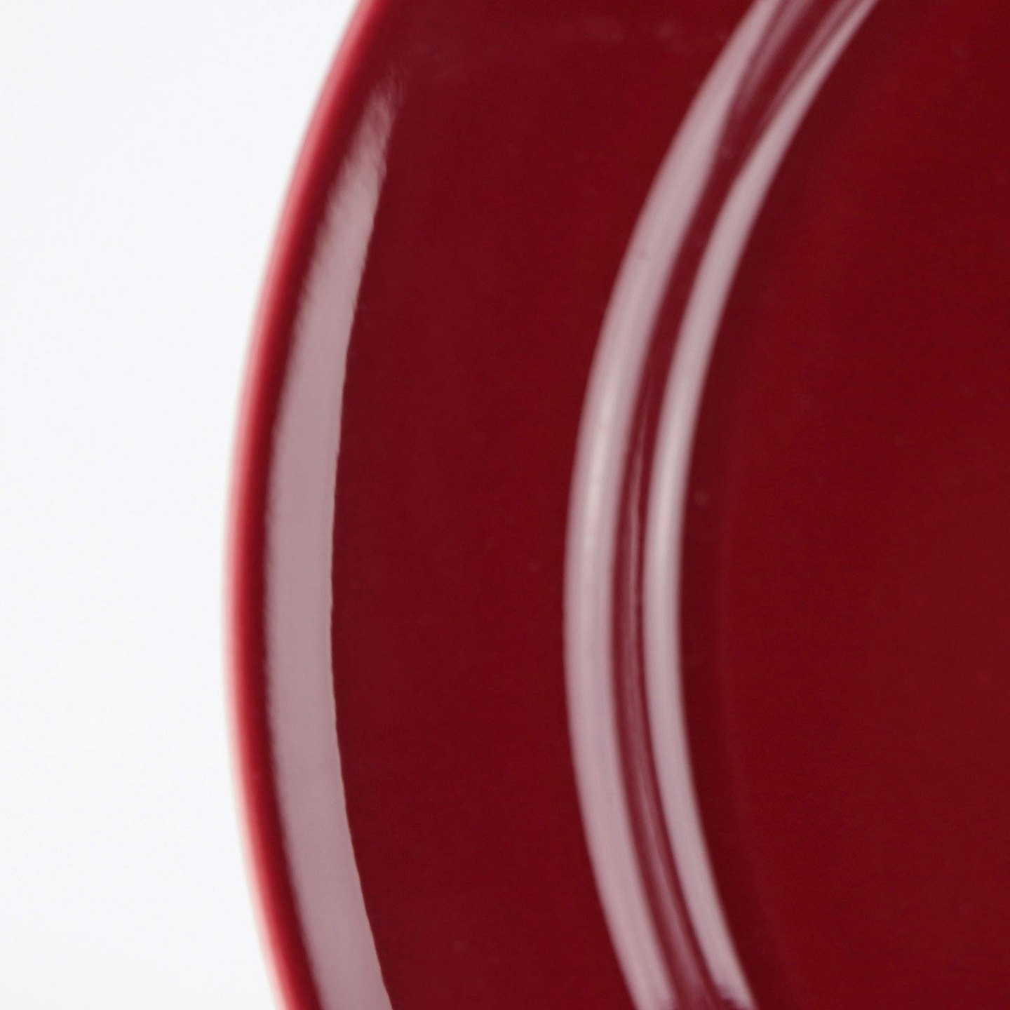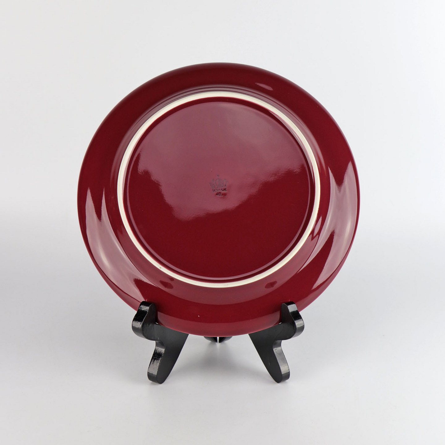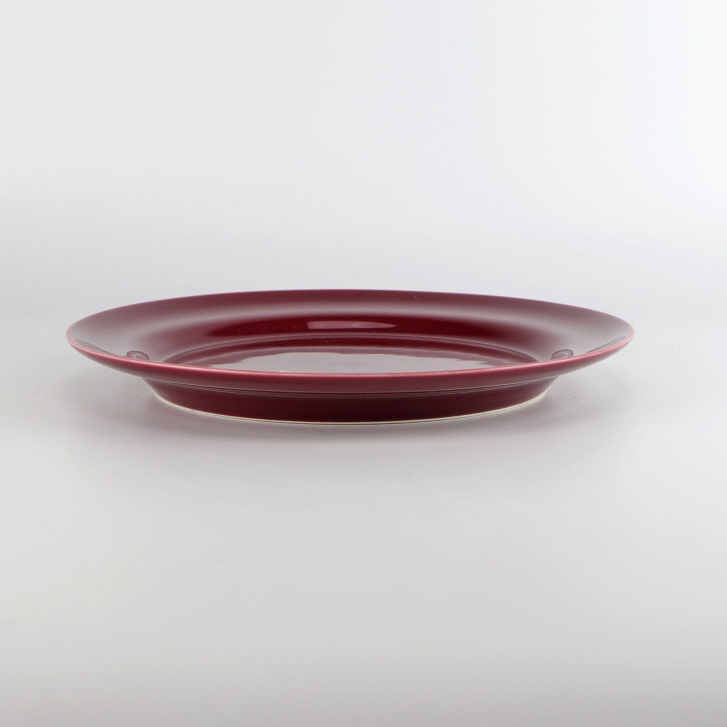 Flad tallerken i porcelæn med glansfuld mørk rød glasur