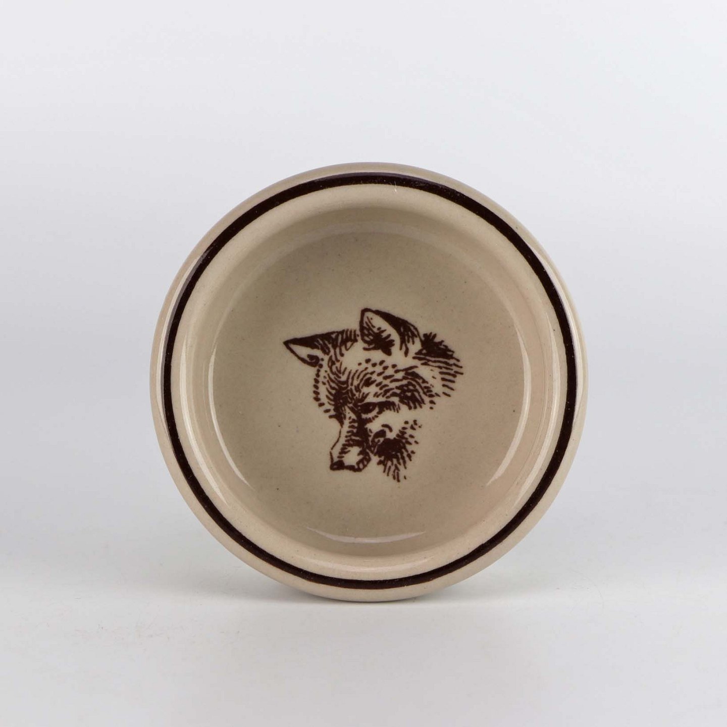 Smørasiet i beigefarvet stentøj med forskellige dyremotiver i brun nuance