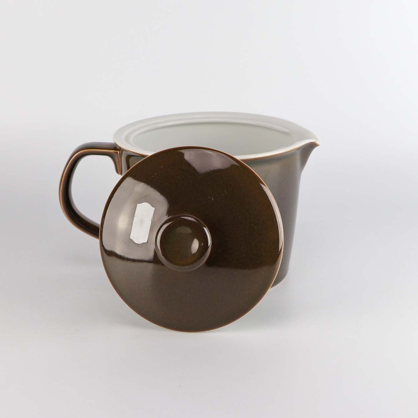 Stel i hvidt porcelæn med brun glasur på ydersiden.