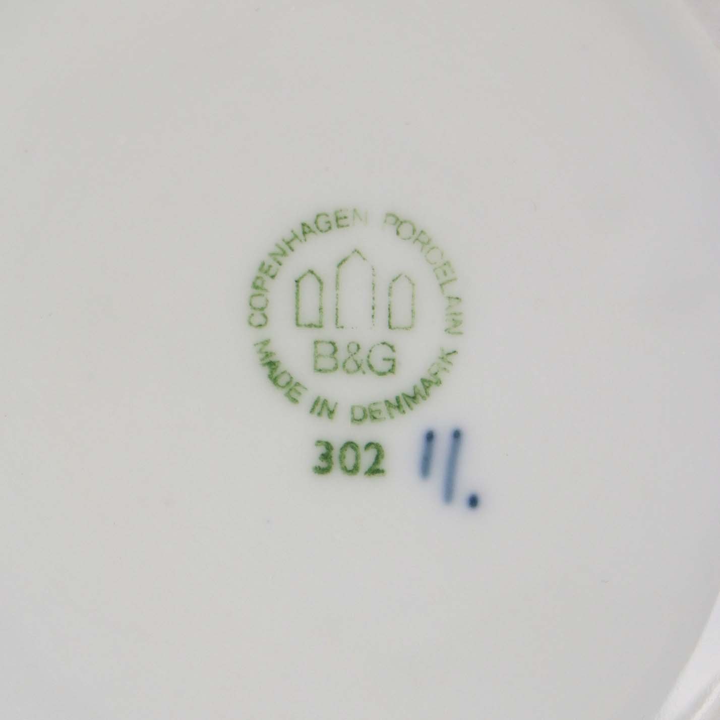 Stel i glat hvidt porcelæn med abstrakt mønster i blå nuancer
