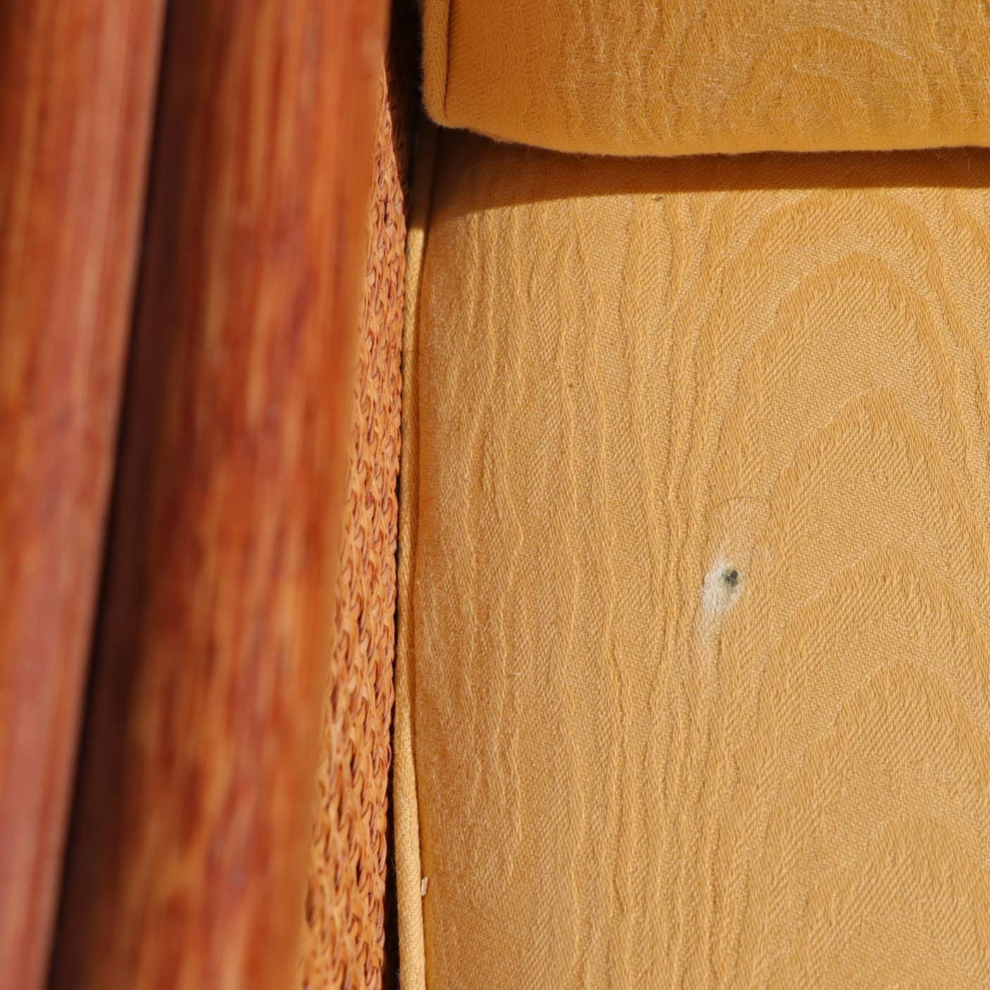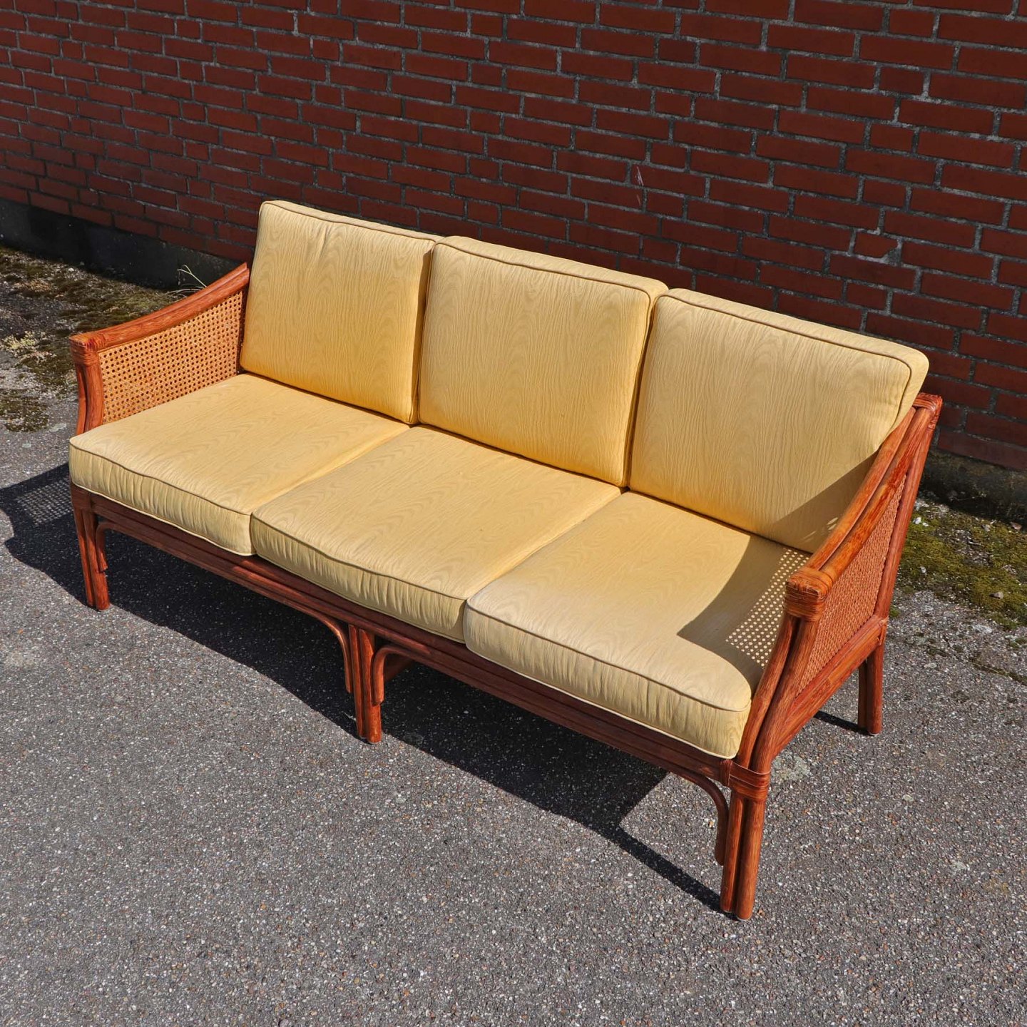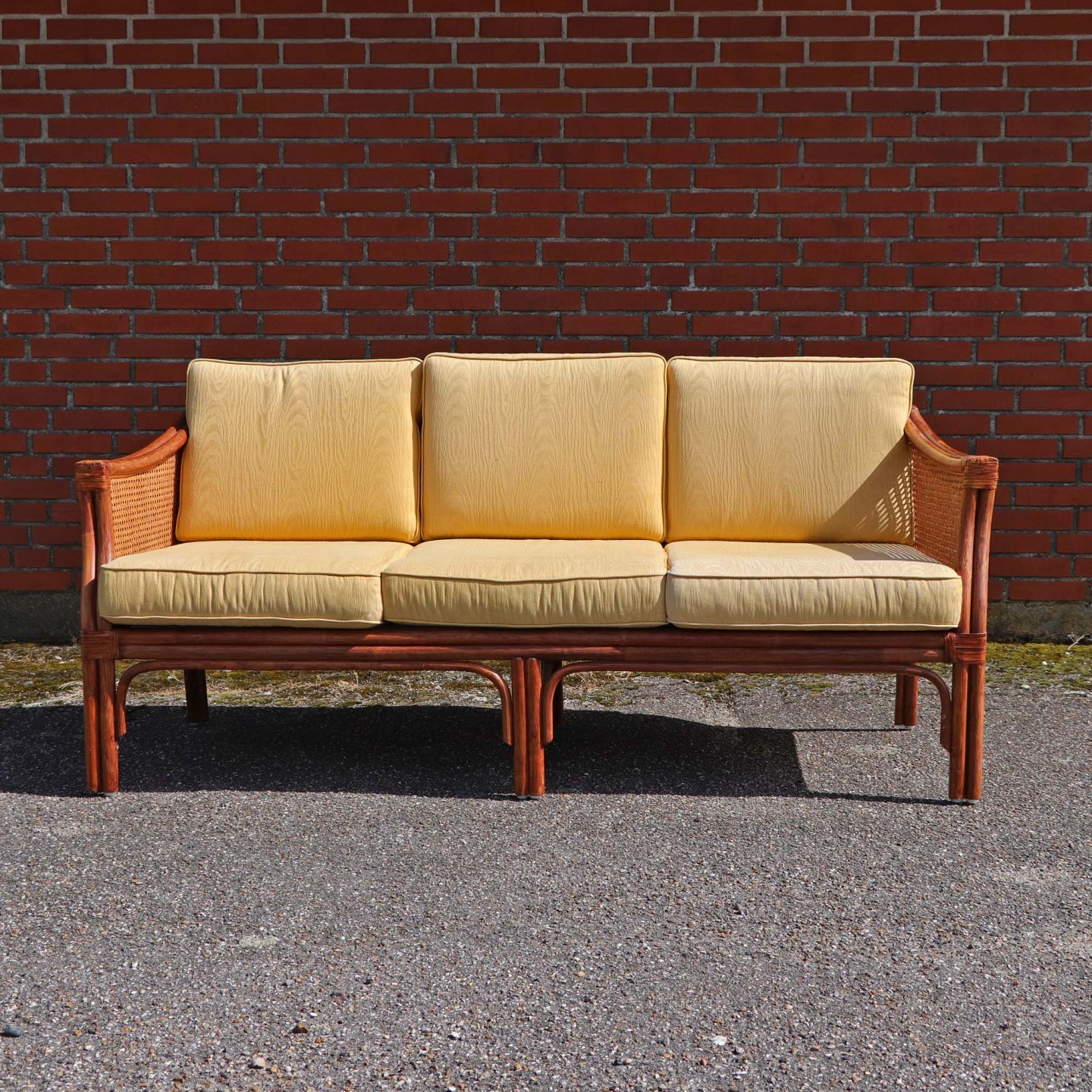 Tre personers sofa i mørk lakeret bambus med flettede sider og skumhynder betrukket med struktureret gult stof. Betrækket er lettere solfalmet.