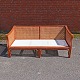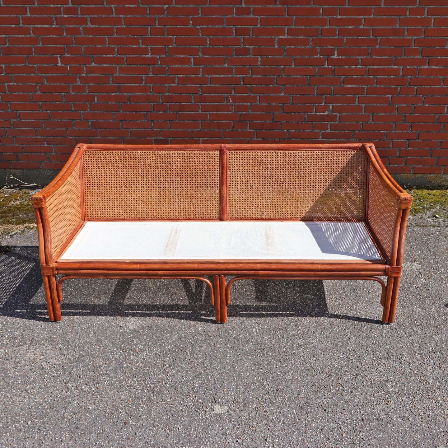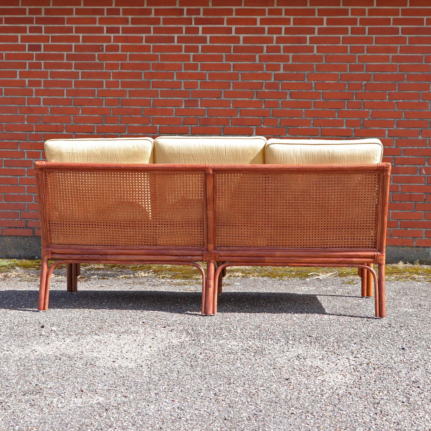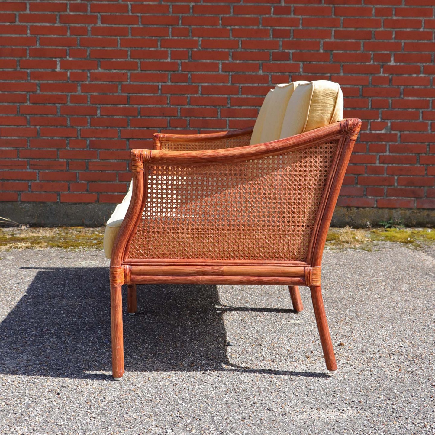 Tre personers sofa i mørk lakeret bambus med flettede sider og skumhynder betrukket med struktureret gult stof. Betrækket er lettere solfalmet.