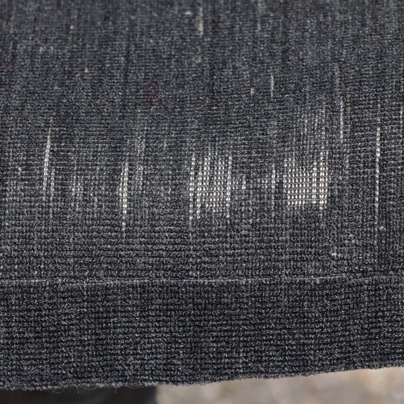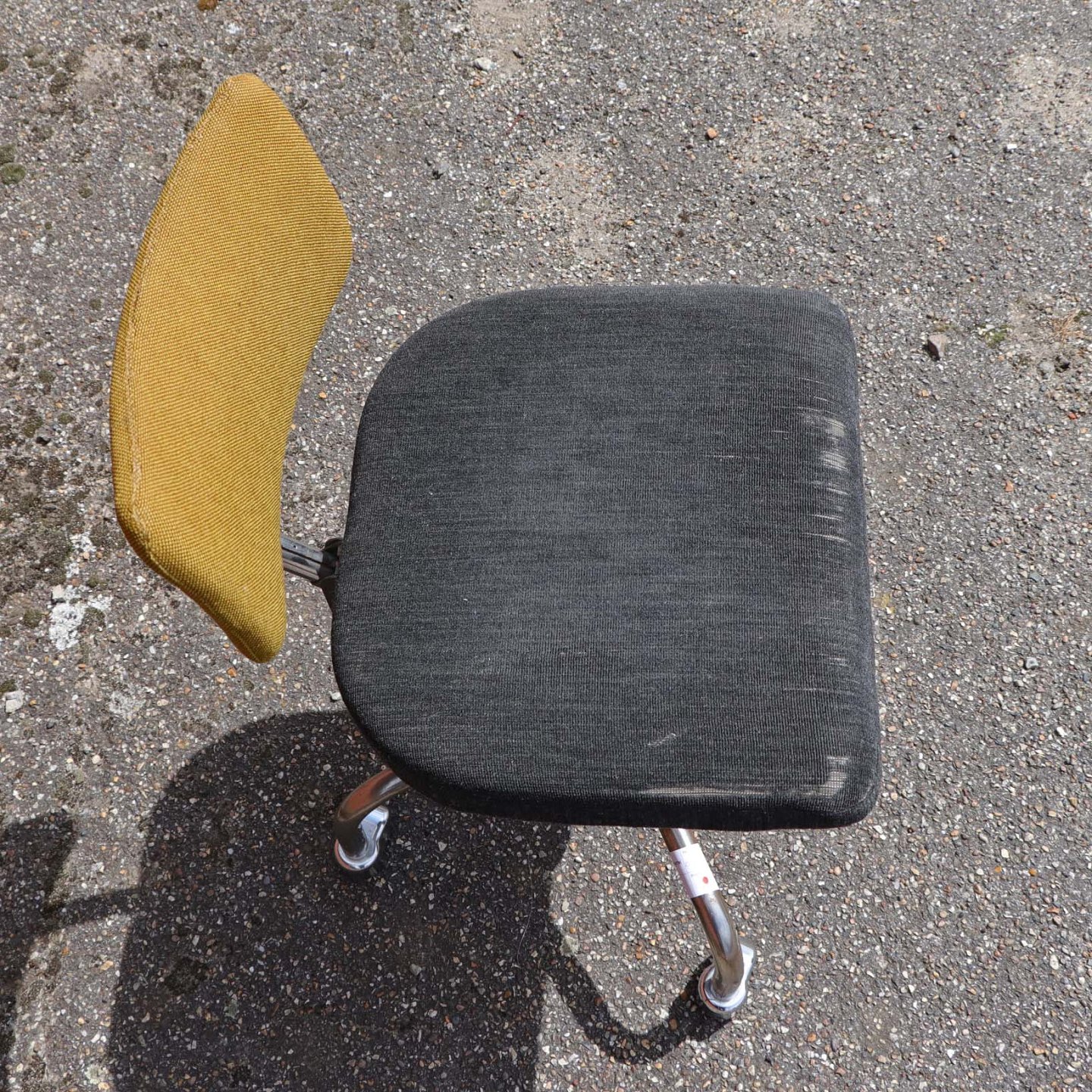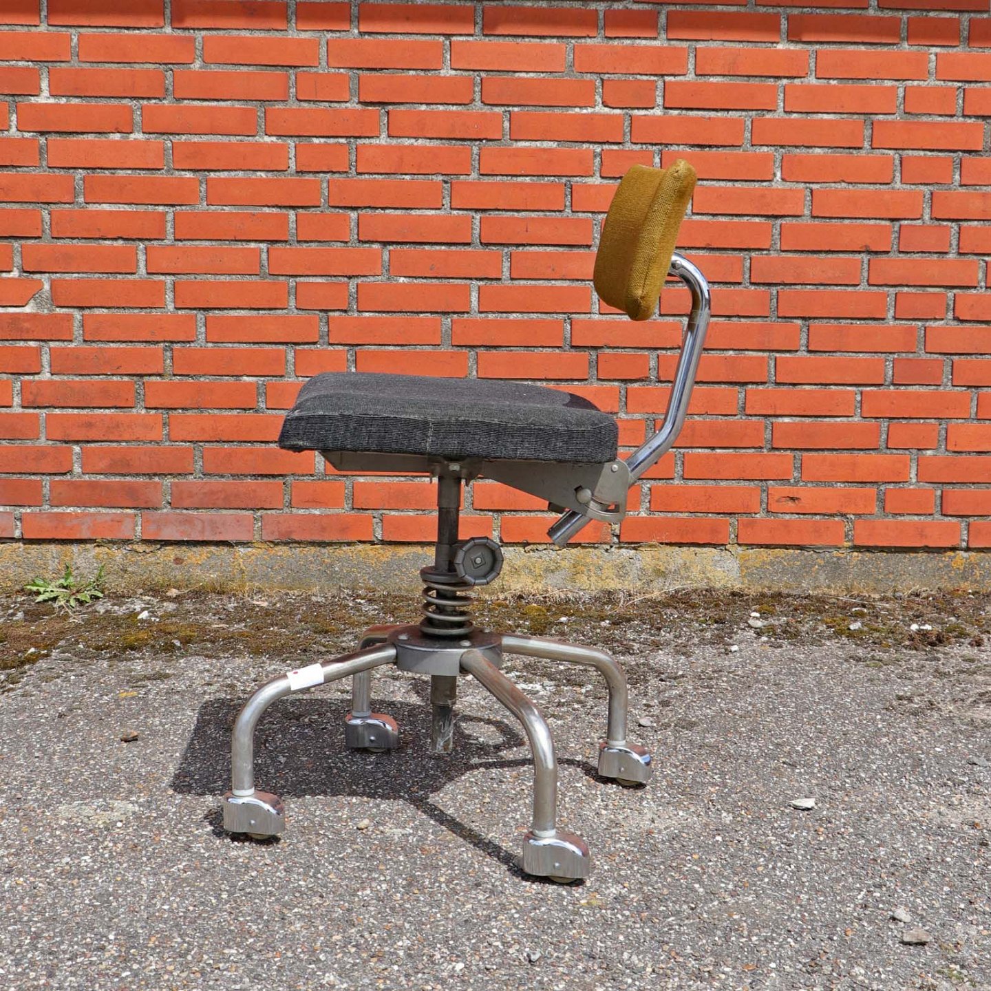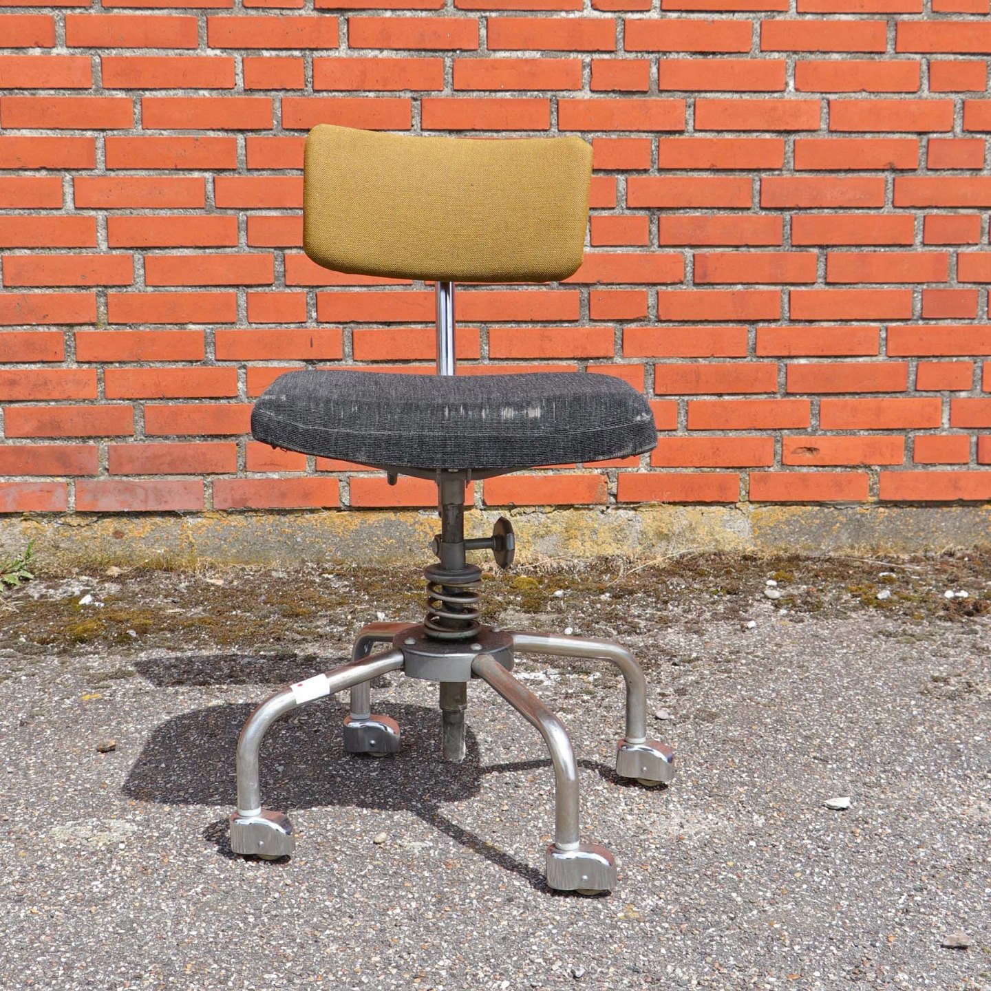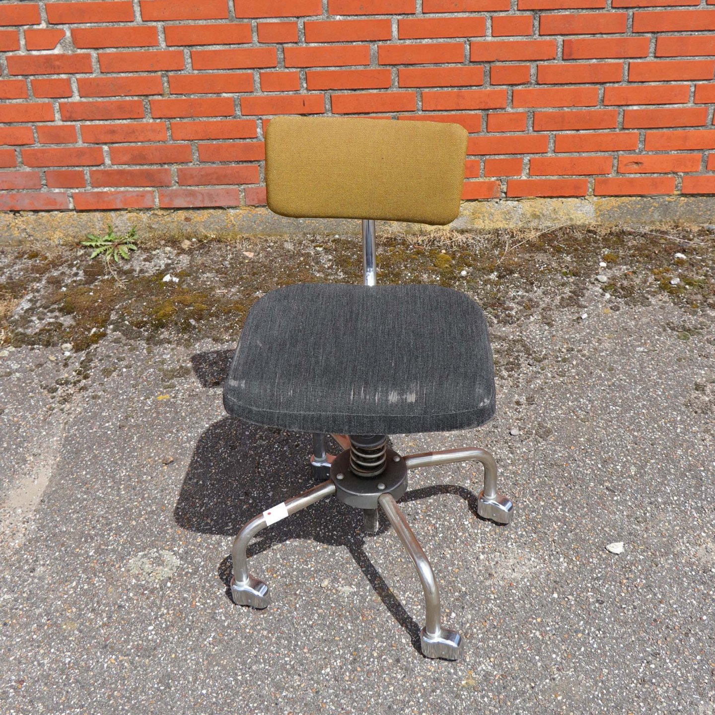 Ældre kontorstol hvor sæde og ryglæn er betrukket i koksgrå og grønlig stof og stel af metal. Regulerbar sædehøjde og rygindstilling. Stolen trænger til ombetrækning af sædet.