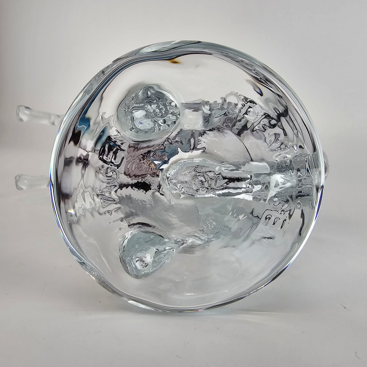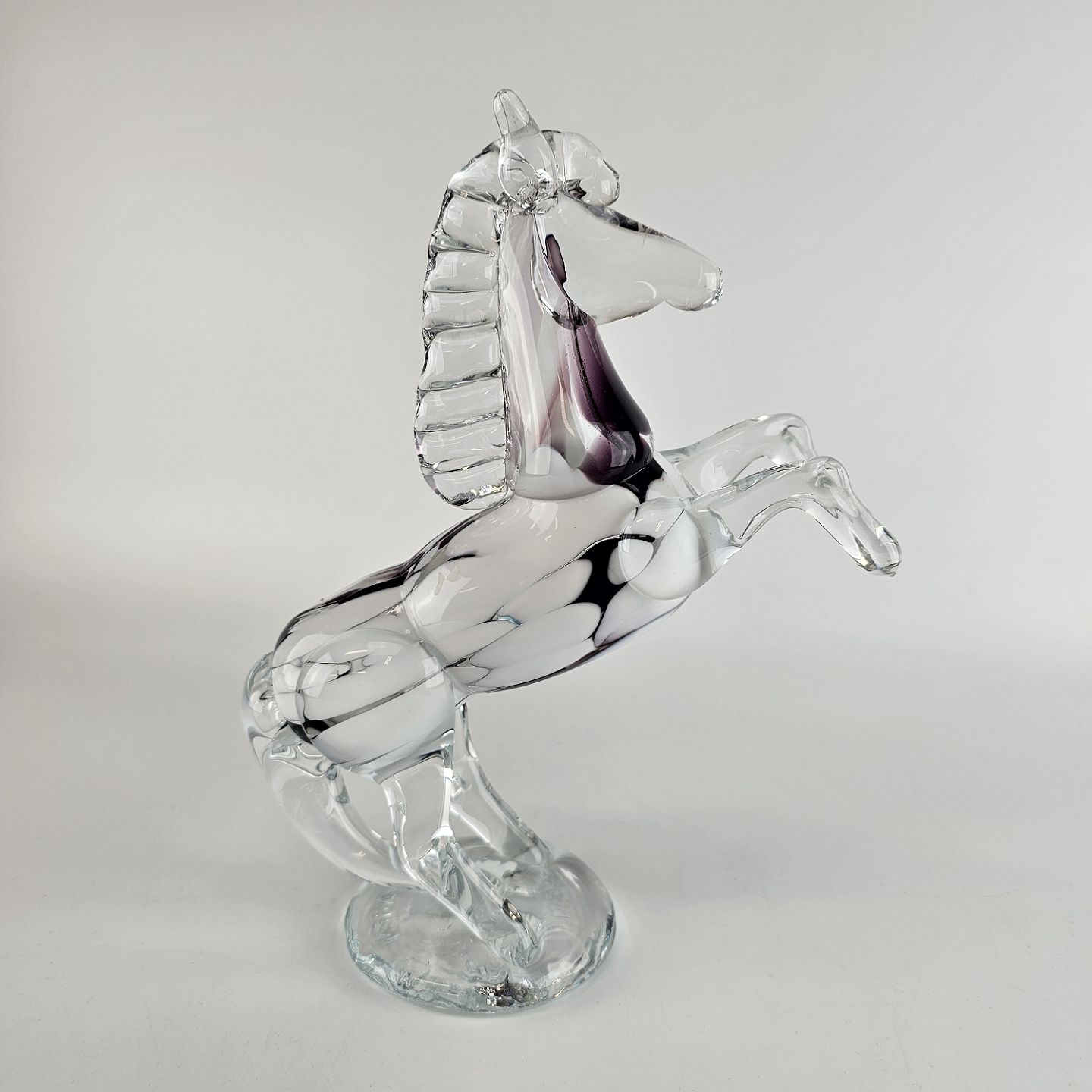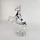 Mundblæst glasfigur formet som en stejlende hest. Det er lavet som fusk, foden er en genbrugt flaskebund, hvor der står Copenhagen