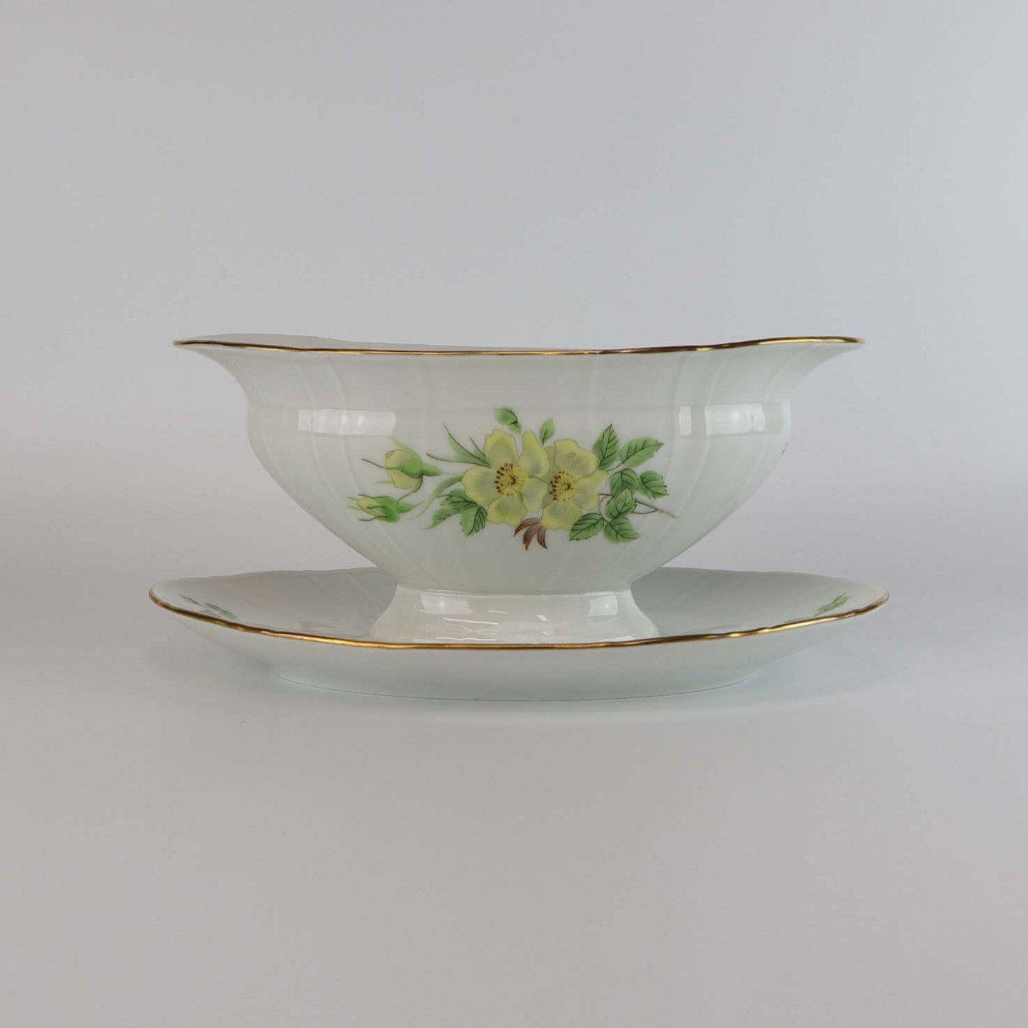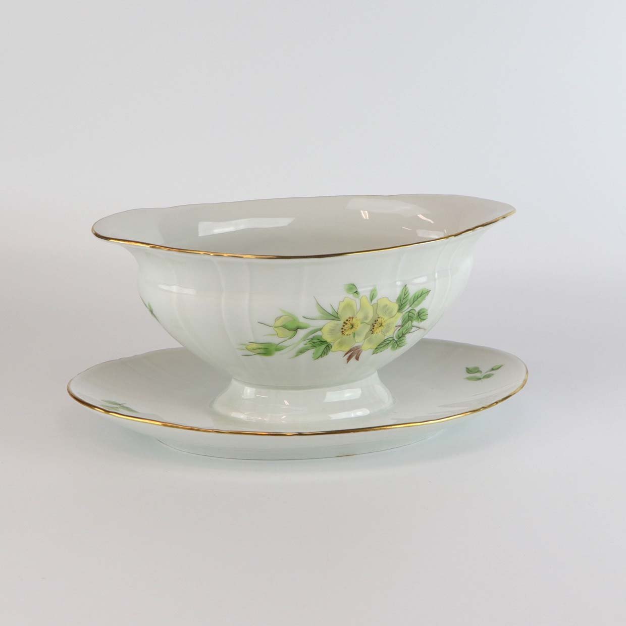 Service i glat hvidt porcelæn med lige knækkede kanter dekoreret med gule blomster og gylden kant