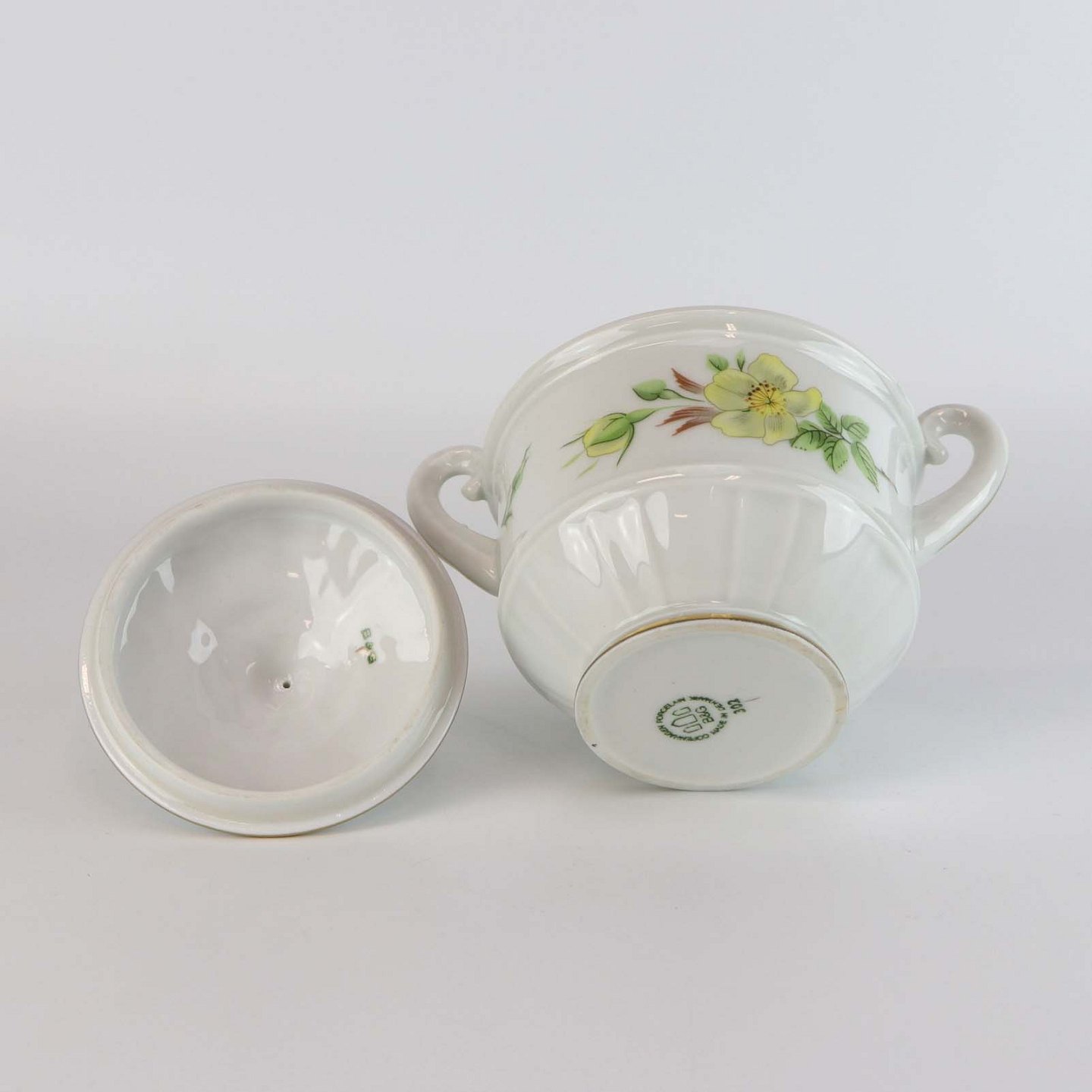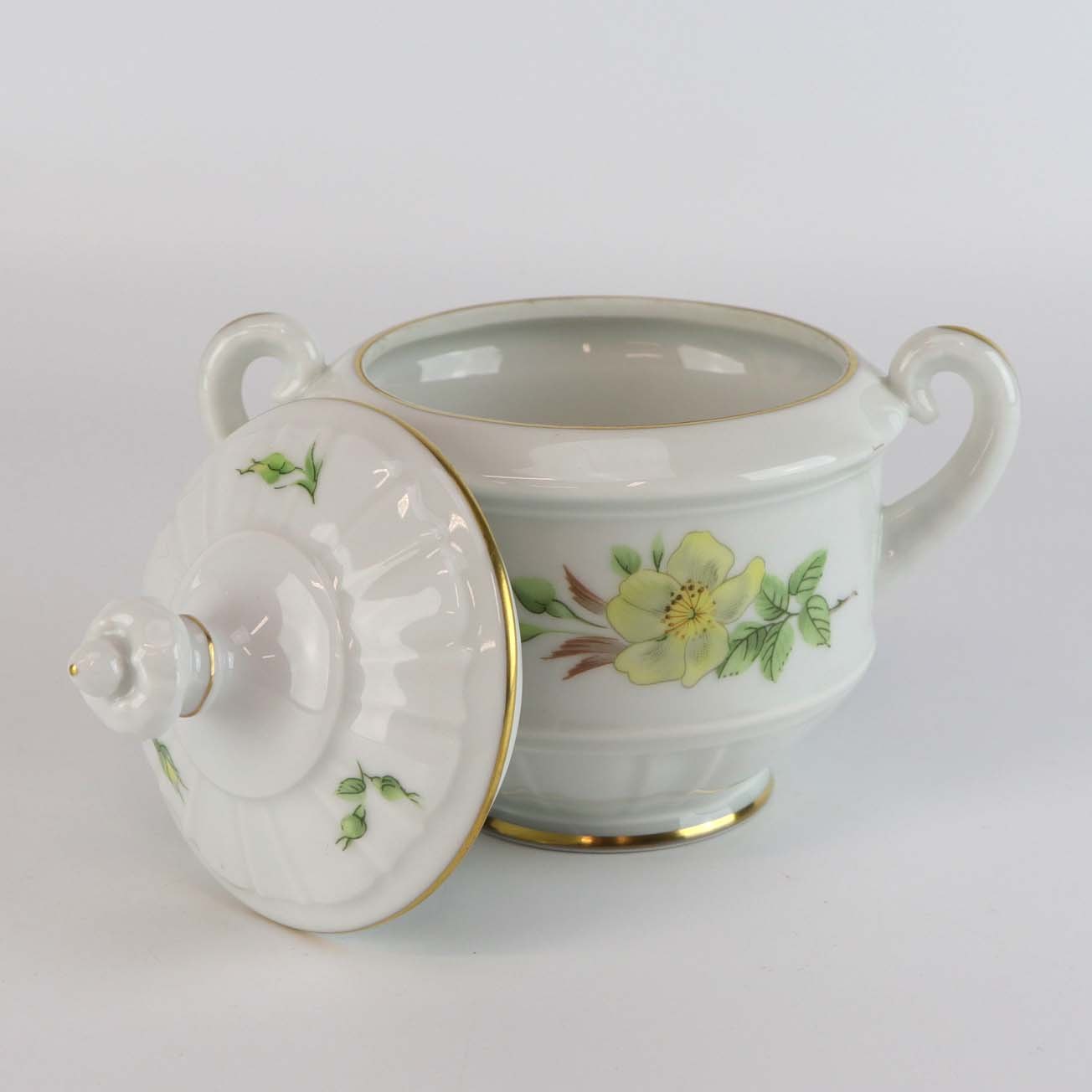 Service i glat hvidt porcelæn med lige knækkede kanter dekoreret med gule blomster og gylden kant