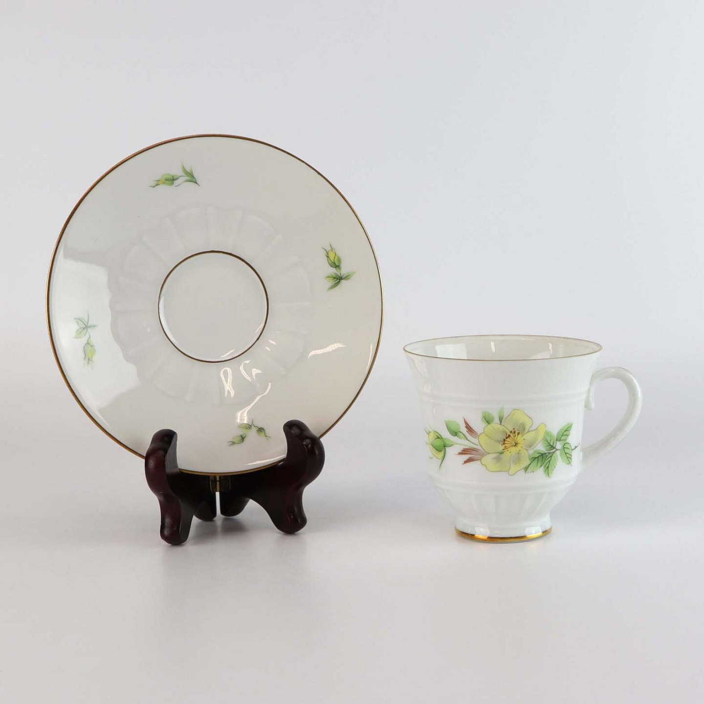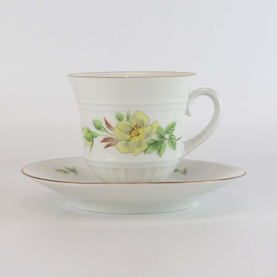 Service i glat hvidt porcelæn med lige knækkede kanter dekoreret med gule blomster og gylden kant