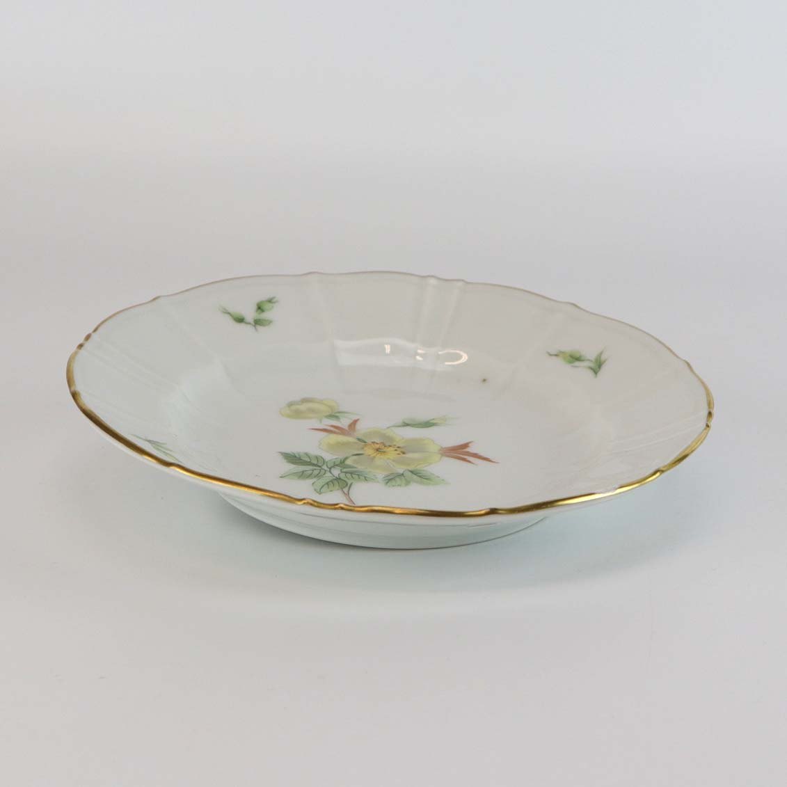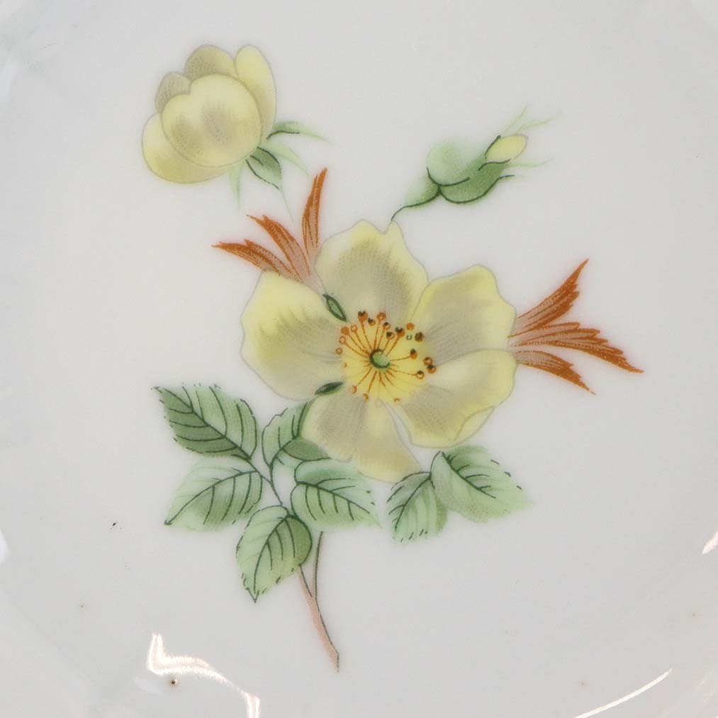 Service i glat hvidt porcelæn med lige knækkede kanter dekoreret med gule blomster og gylden kant