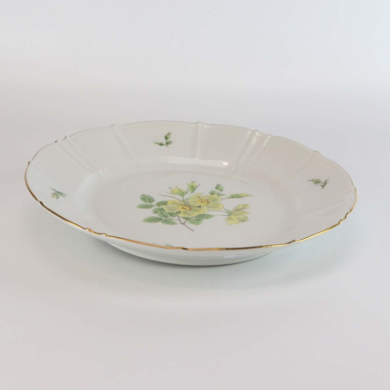 Service i glat hvidt porcelæn med lige knækkede kanter dekoreret med gule blomster og gylden kant