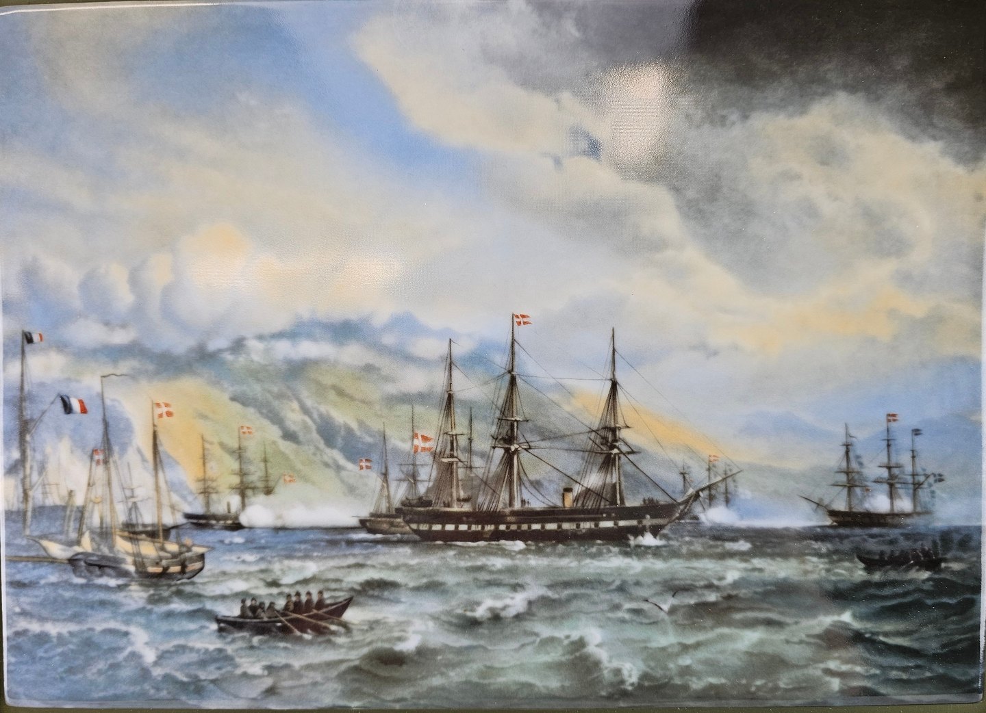 Maleri på porcelænsplade. Maleriet er en gengivelse af C. F. Sørensens maleri med titler Fregatten Jylland Under Island 1874.