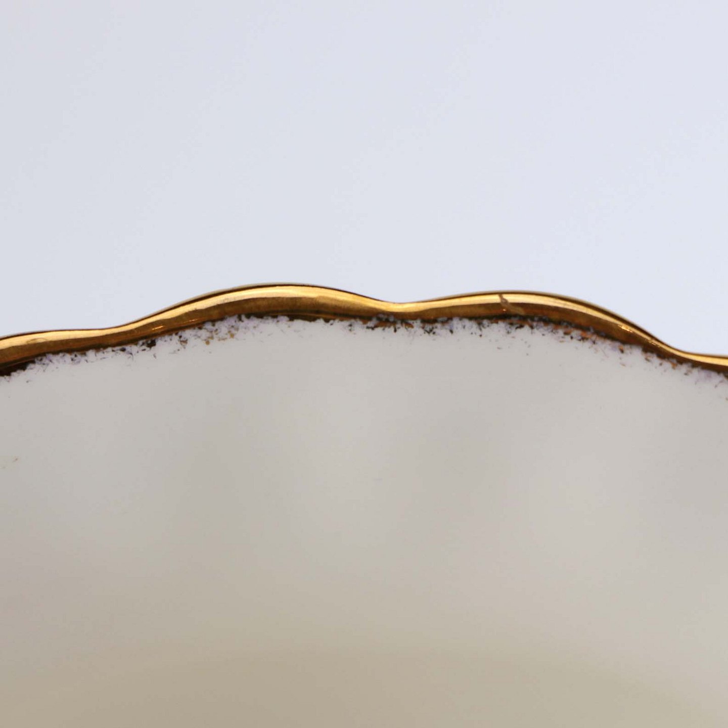 Service i glat hvidt porcelæn med motiv af farverige roser. Topkanten har en let bølget form belagt med gylden dekoration.