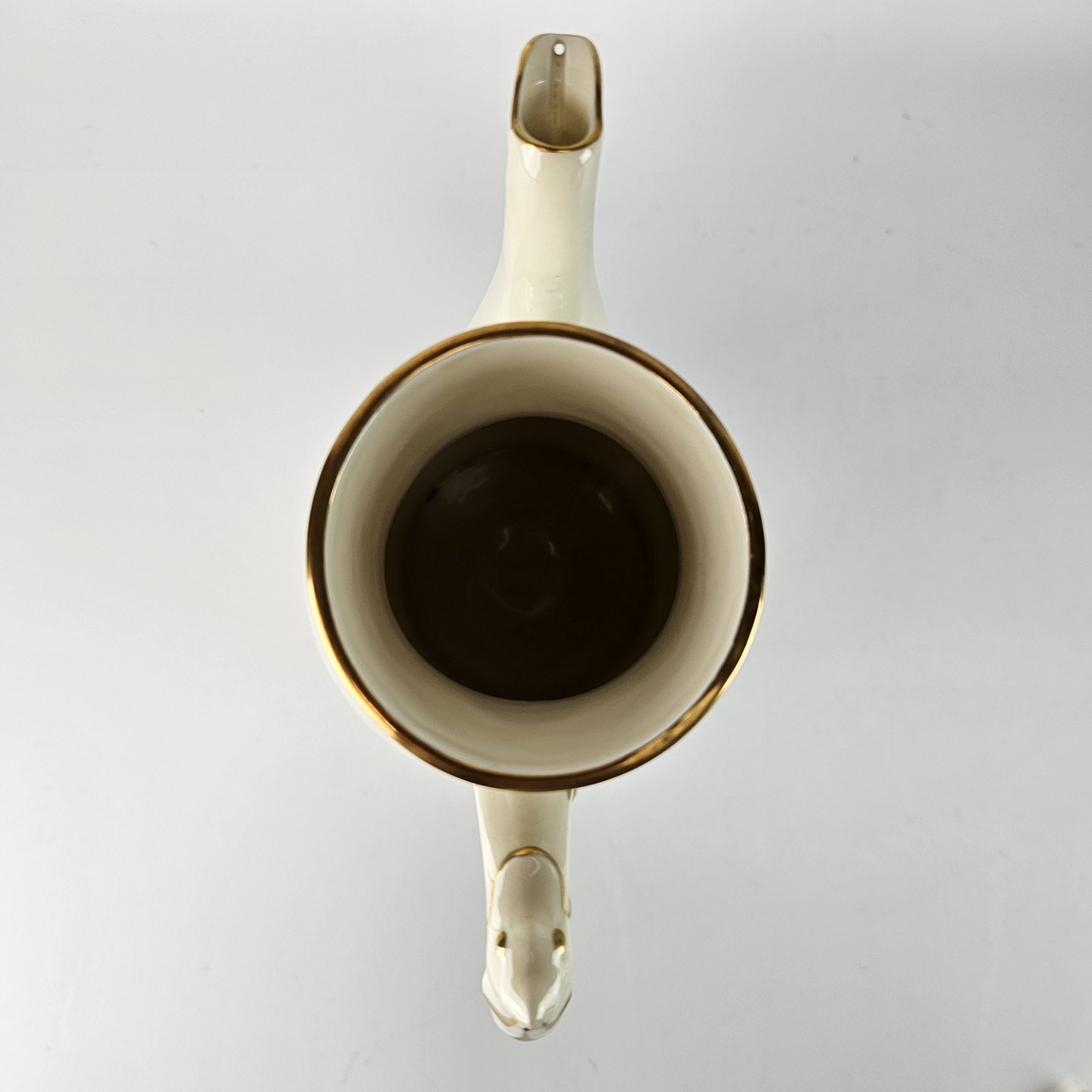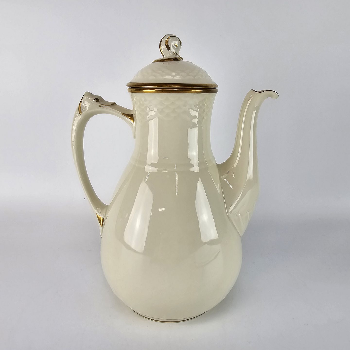 Åkjær er cremefarvet porcelæn med guldkant og mønster, der ligner skæl
