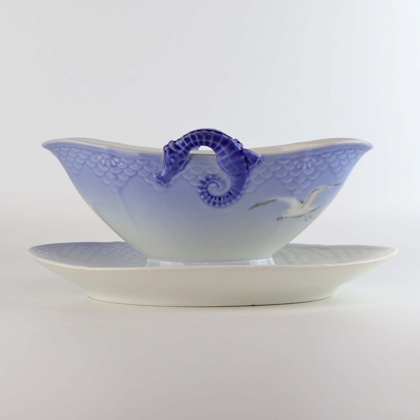 Service i glat porcelæn med skælform i blålige farver og motiv af måger