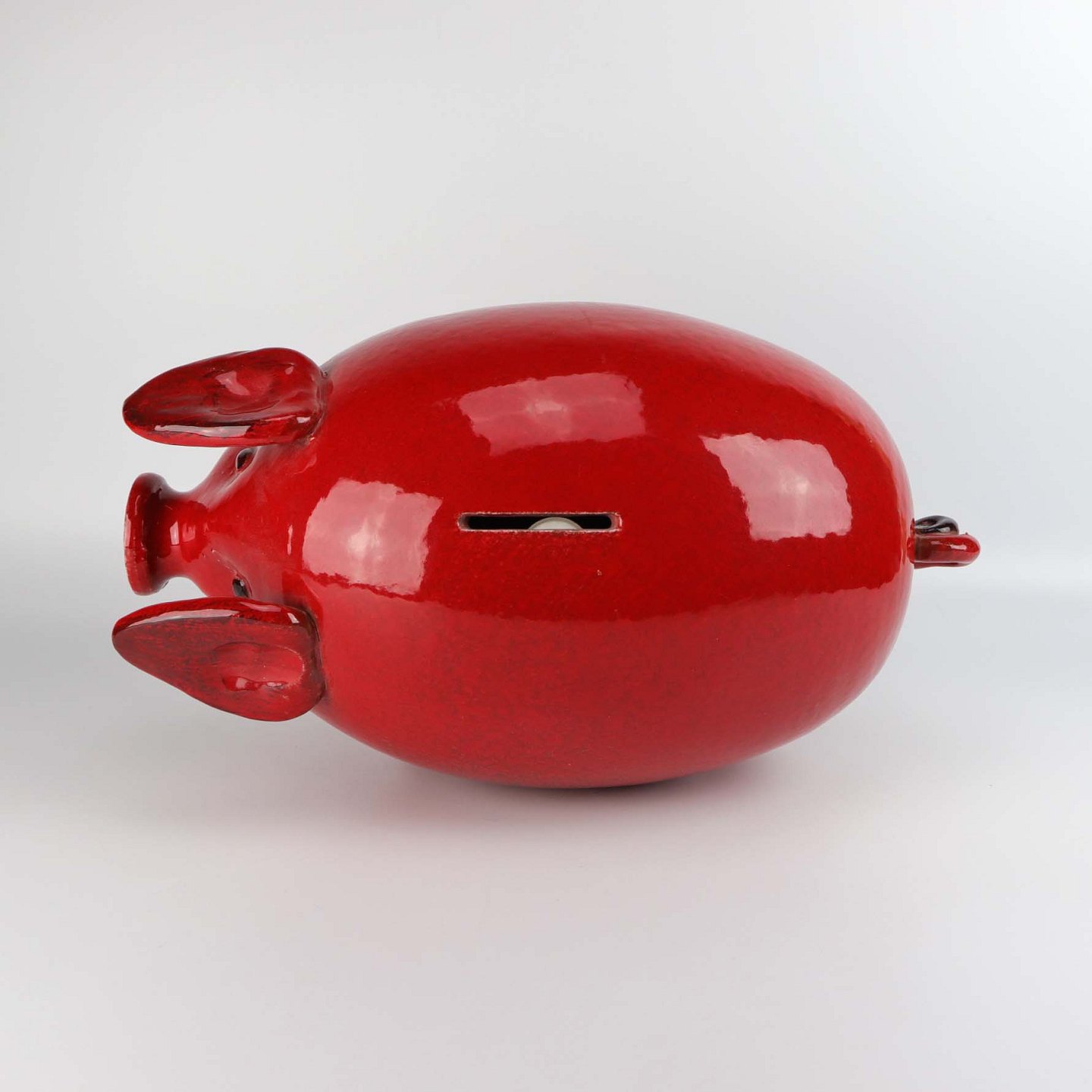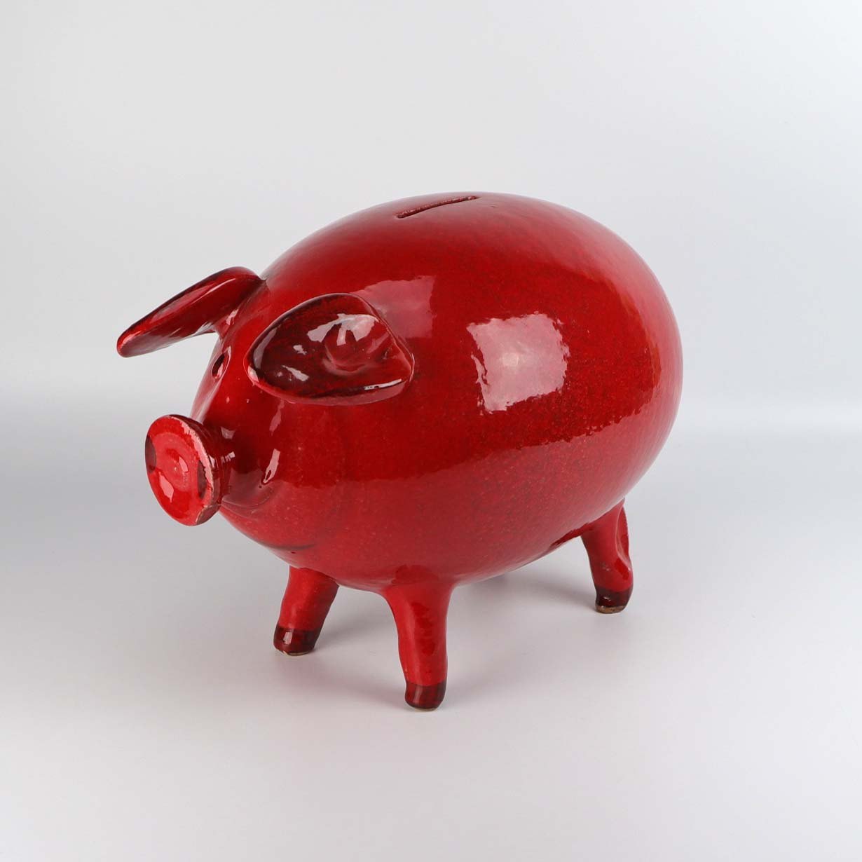 Stor sparegris i rødglaseret keramik og aftagelig bundprop i plast