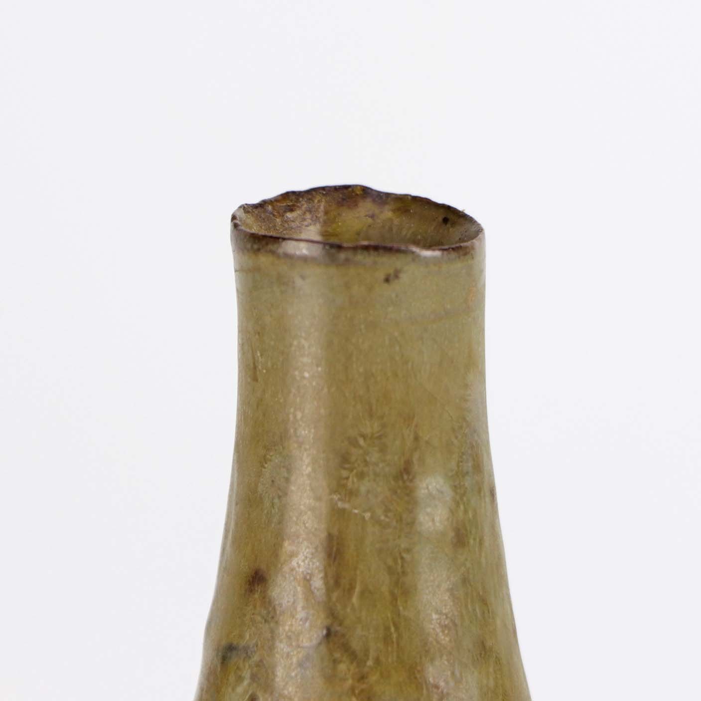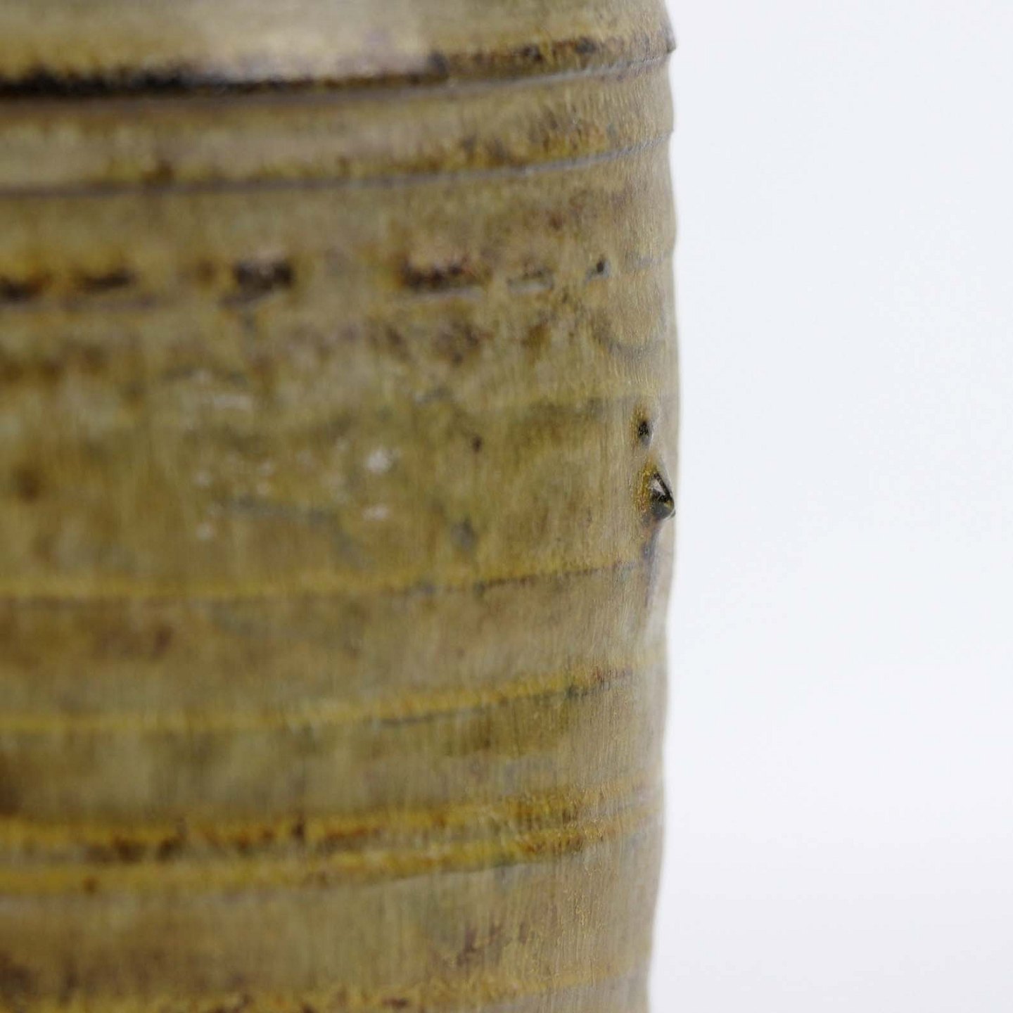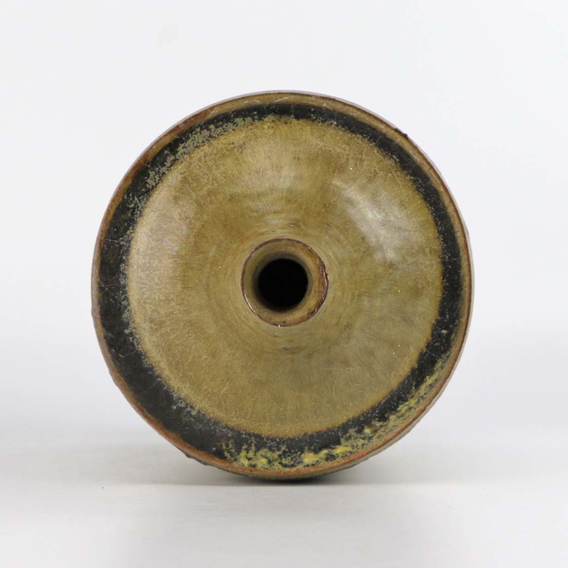 Vase i brunt struktureret stentøj med slank hals og nister. Vasen har en assymmetrisk åbning