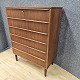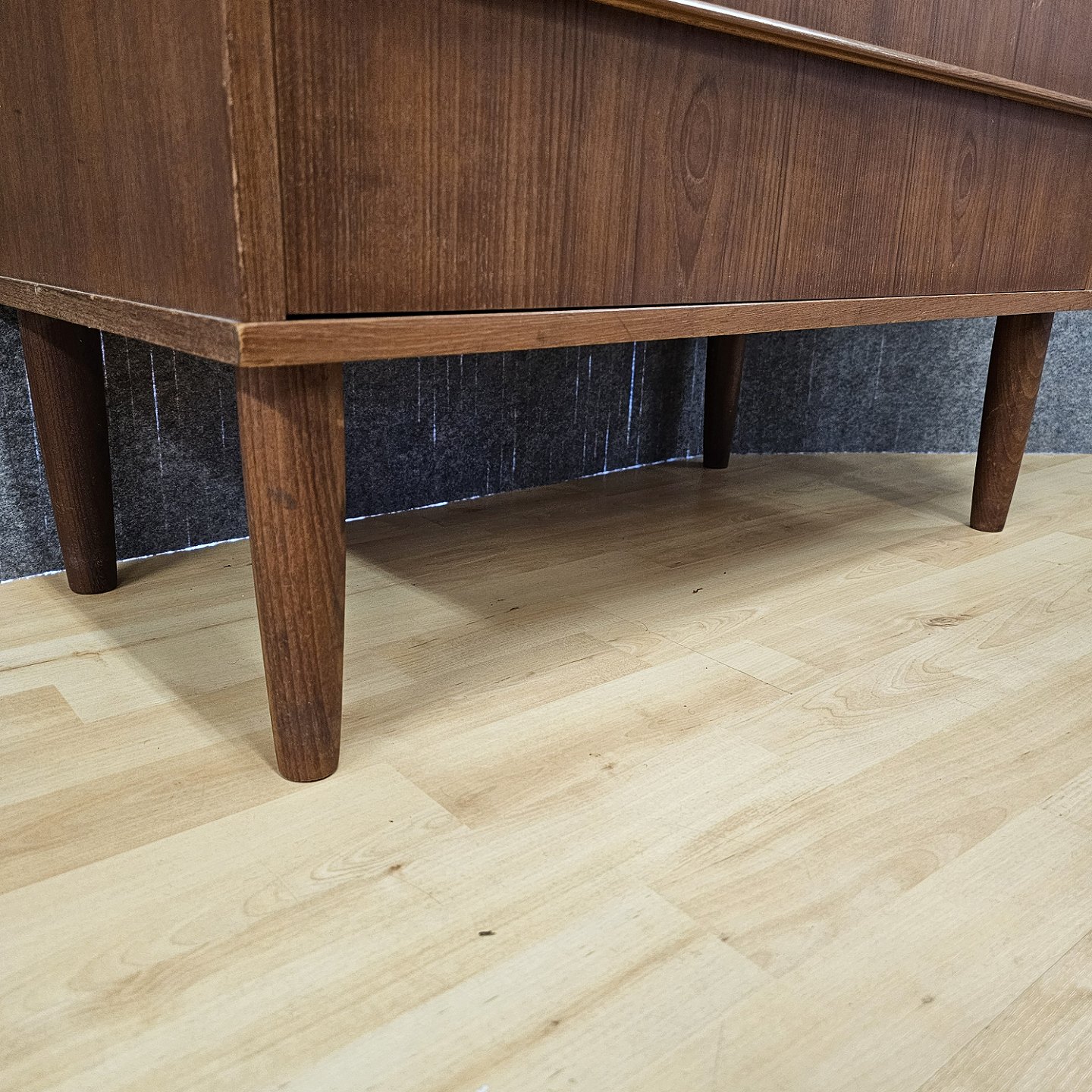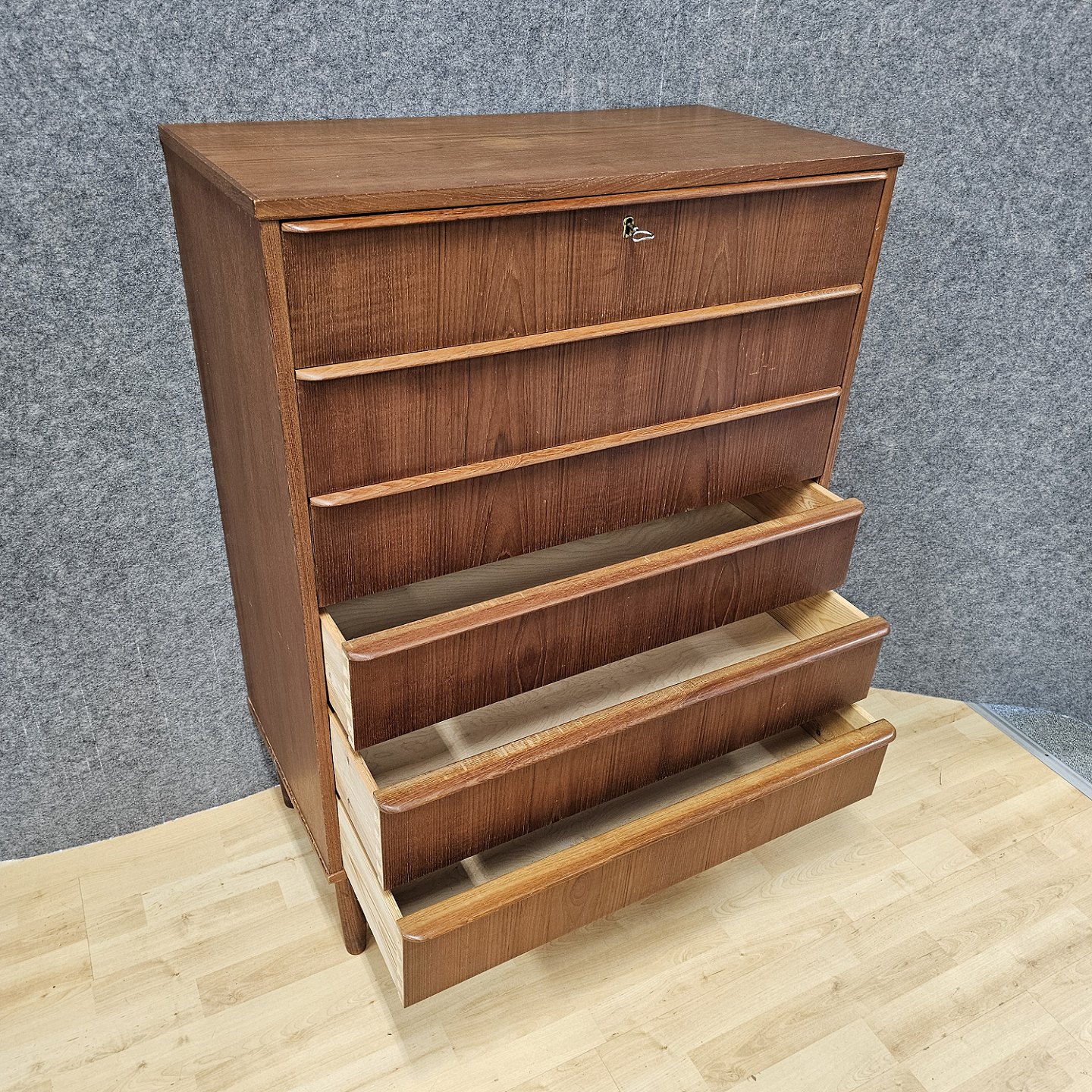 Teak kommode med seks skuffer. Der er fungerende lås og nøgle til øverst skuffe.