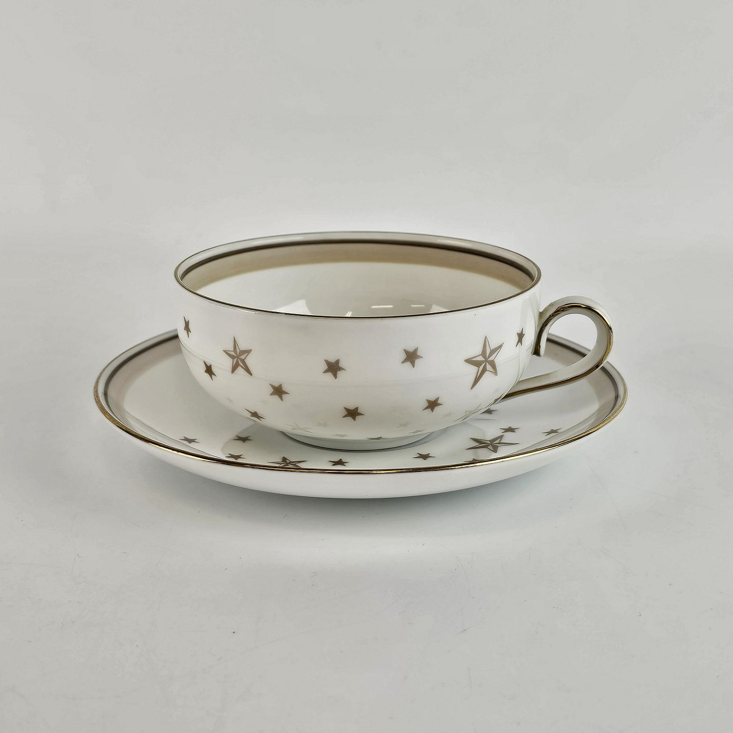 Mælkevejen er af hvidt porcelæn dekoreret med stjerner, en brun ring og guldkanter. Brugsspor kan forekomme