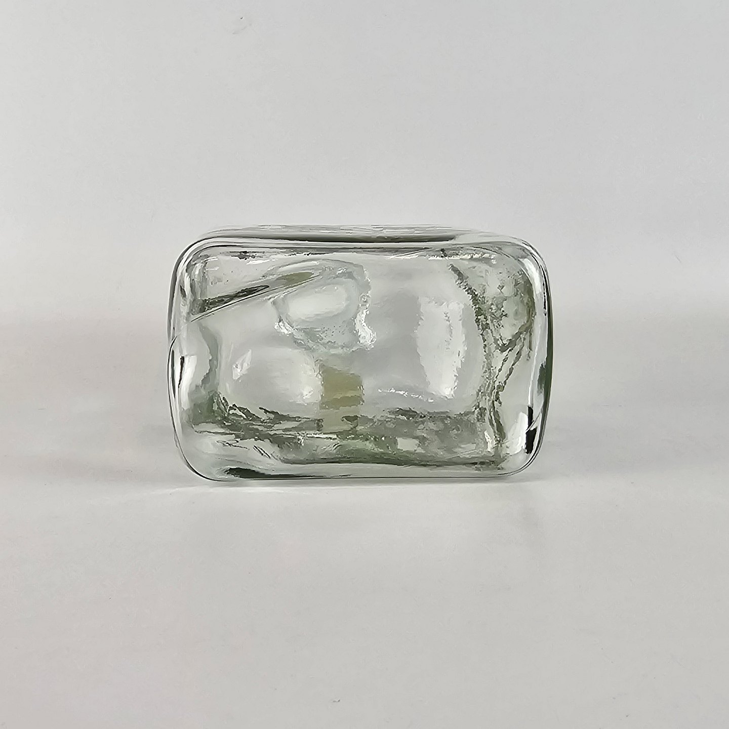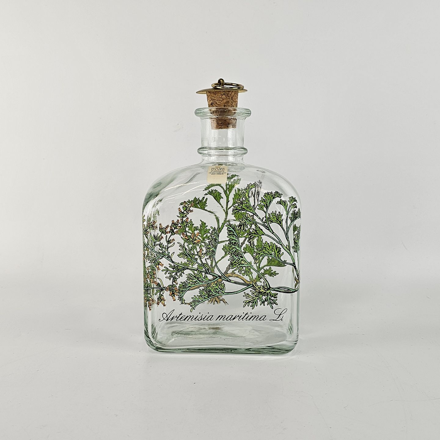 Firkantet karaffel med buet top og tilhørende korkprop. Dekoreret med en gren af malurt, der slynger sig om karaflen og teksten Artemisia maritima L.