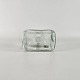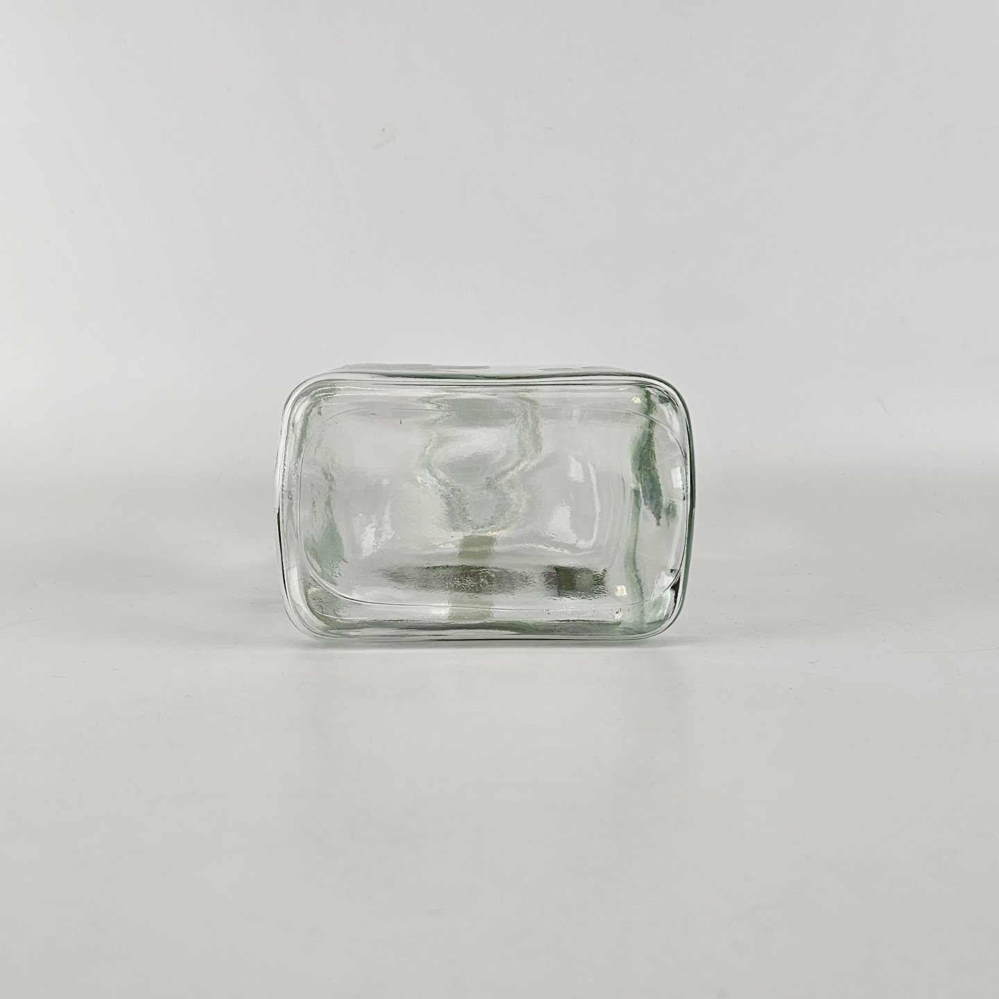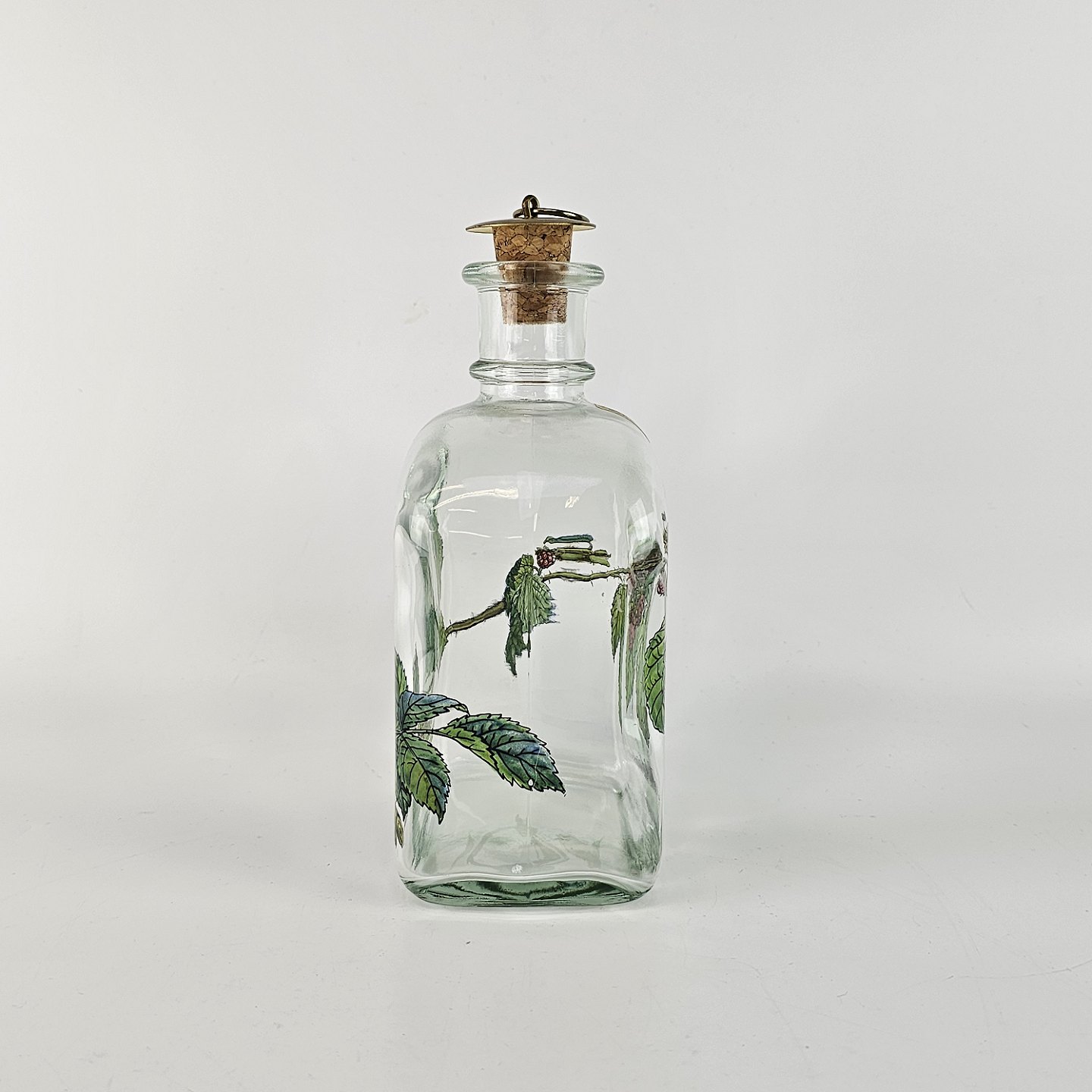 Firkantet karaffel med buet top og tilhørende korkprop. Dekoreret med en gren af hindbær, der slynger sig om karaflen og teksten Rubus idacus L