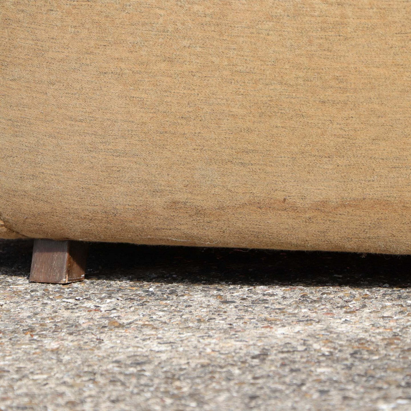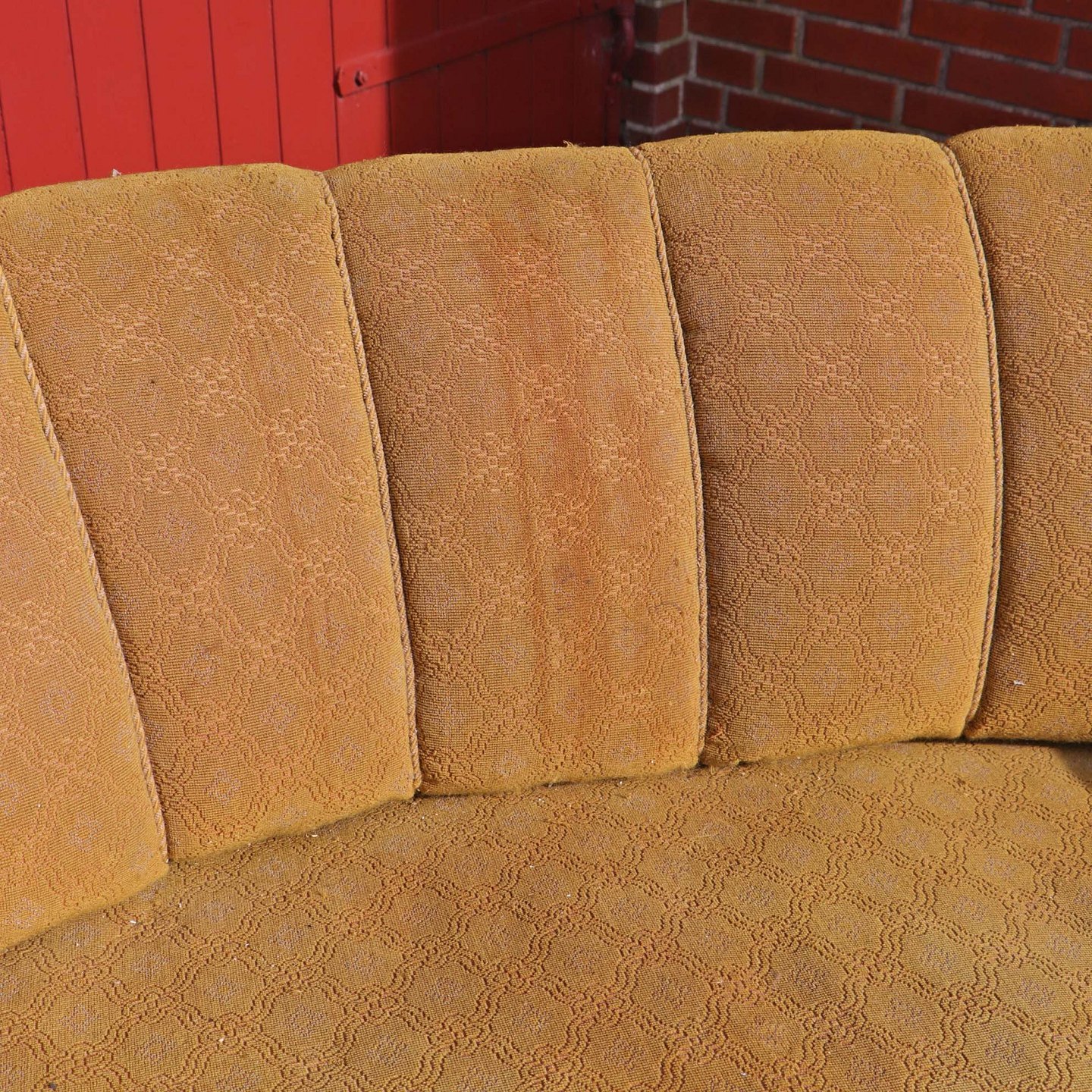 Ældre to personers sofa med form som en banan. Sofaen har sæde af springfjeder og er betrukket med slidtstærkt grøngul mønstret stof og mørk lakeret træben.
