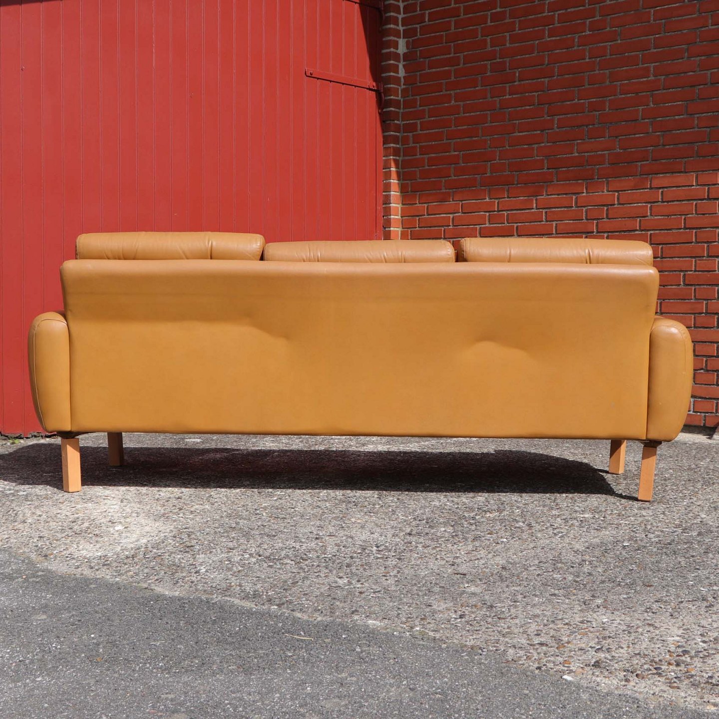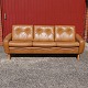 Tre personers connac sofa i læder med lyse træben. Sofaens læder er solbleget.