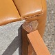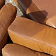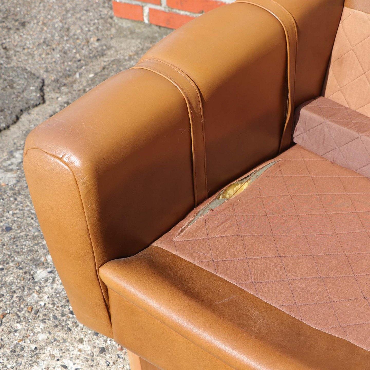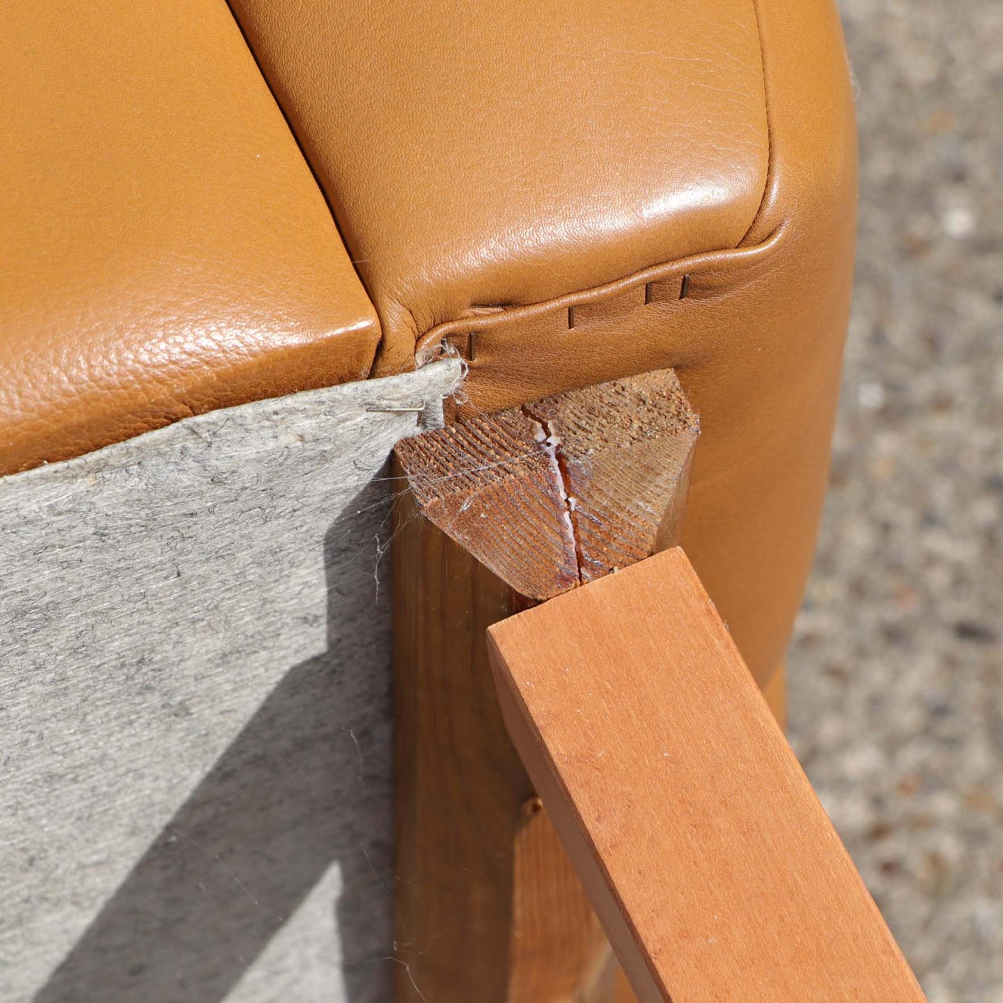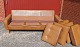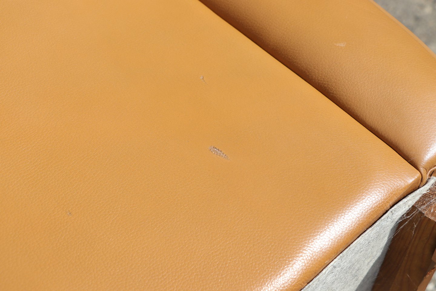 Fremstår med brugsspor. Enkel rift i betrækket under puderne og slidte pynte syninger enkelte steder samt mindre hul på bagsiden. Revne i træstel ved en enkelt fod.