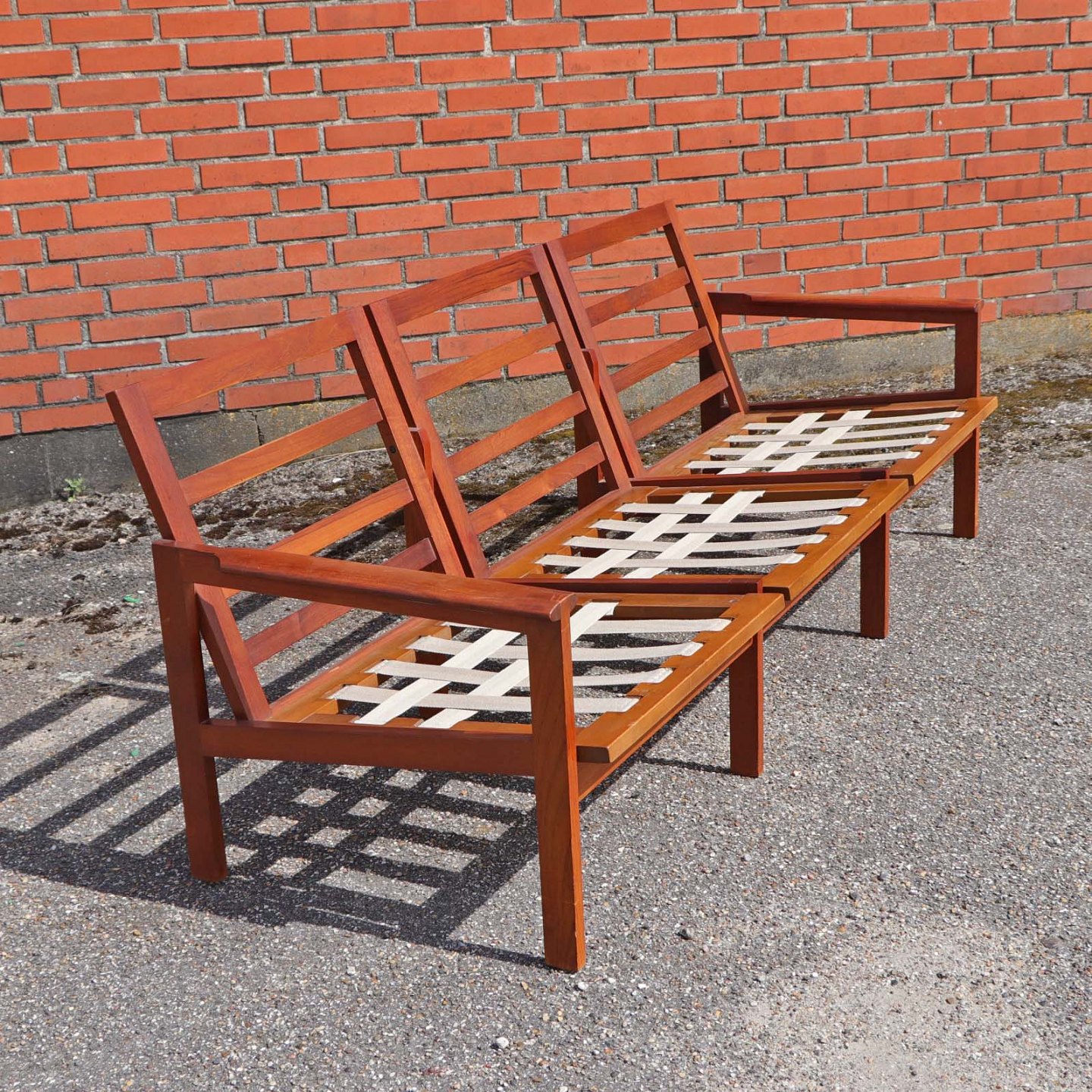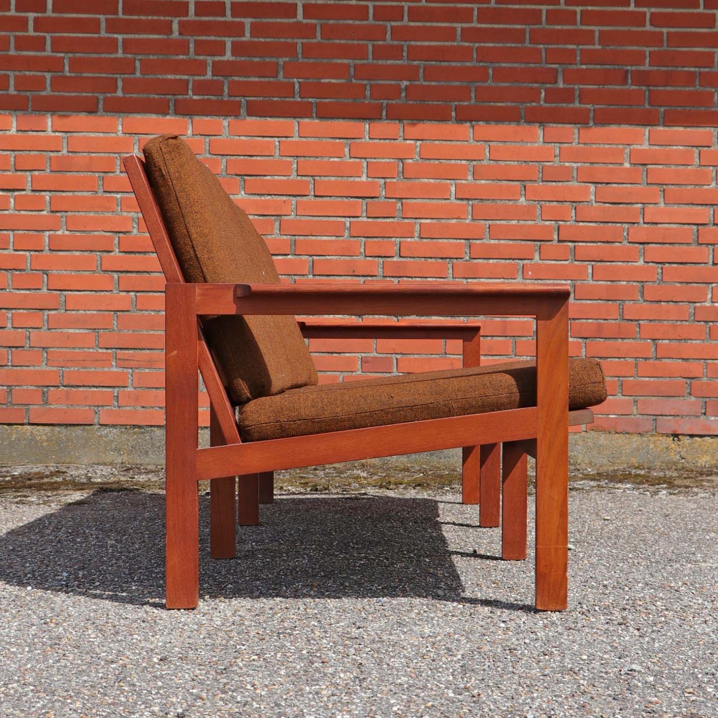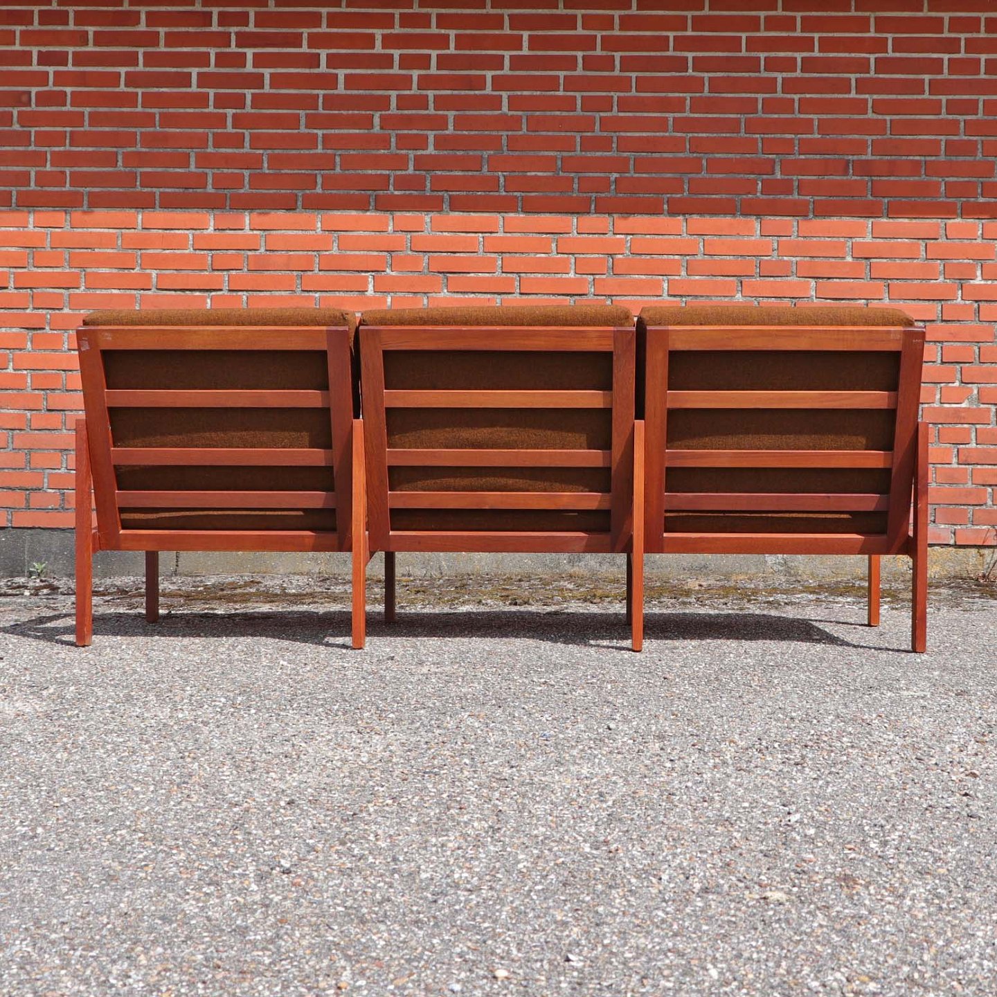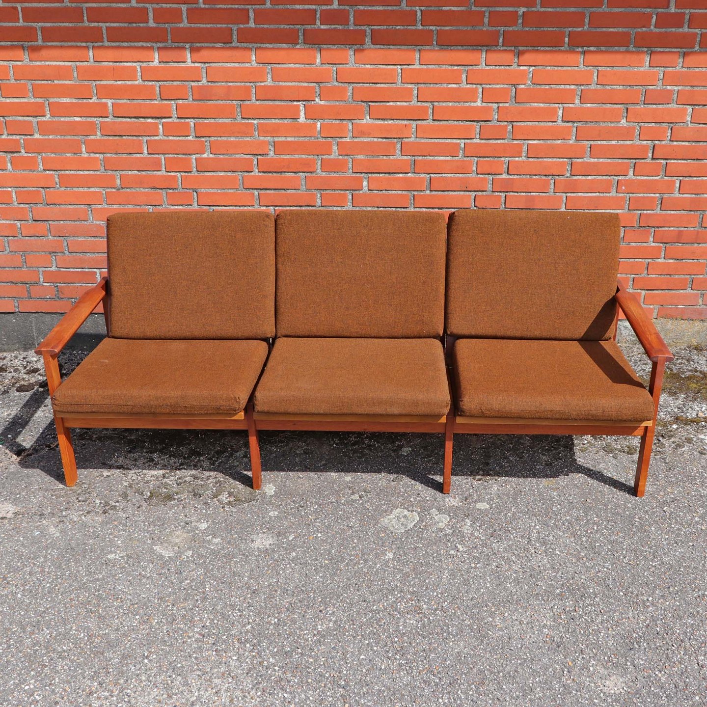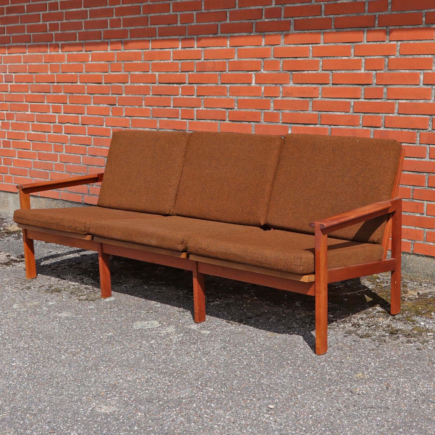 Tre personers sofa model Capella med stel i lakeret teaktræ og hynder betrukket med brunmeleret uldstof.